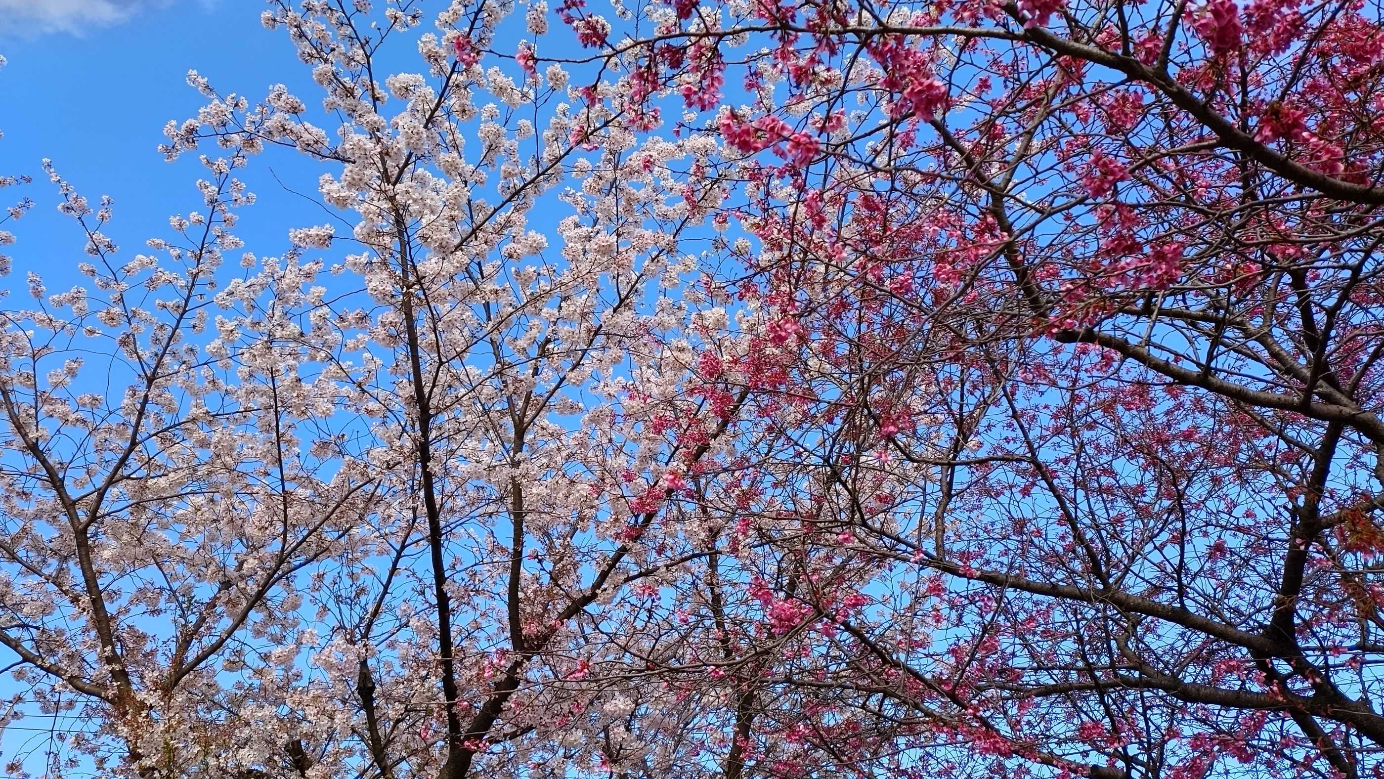 花散らしの雨の翌日の公園のそばを通ったのでパシャリ色合いがめでたい大事にされている青空の桜の向こうに月