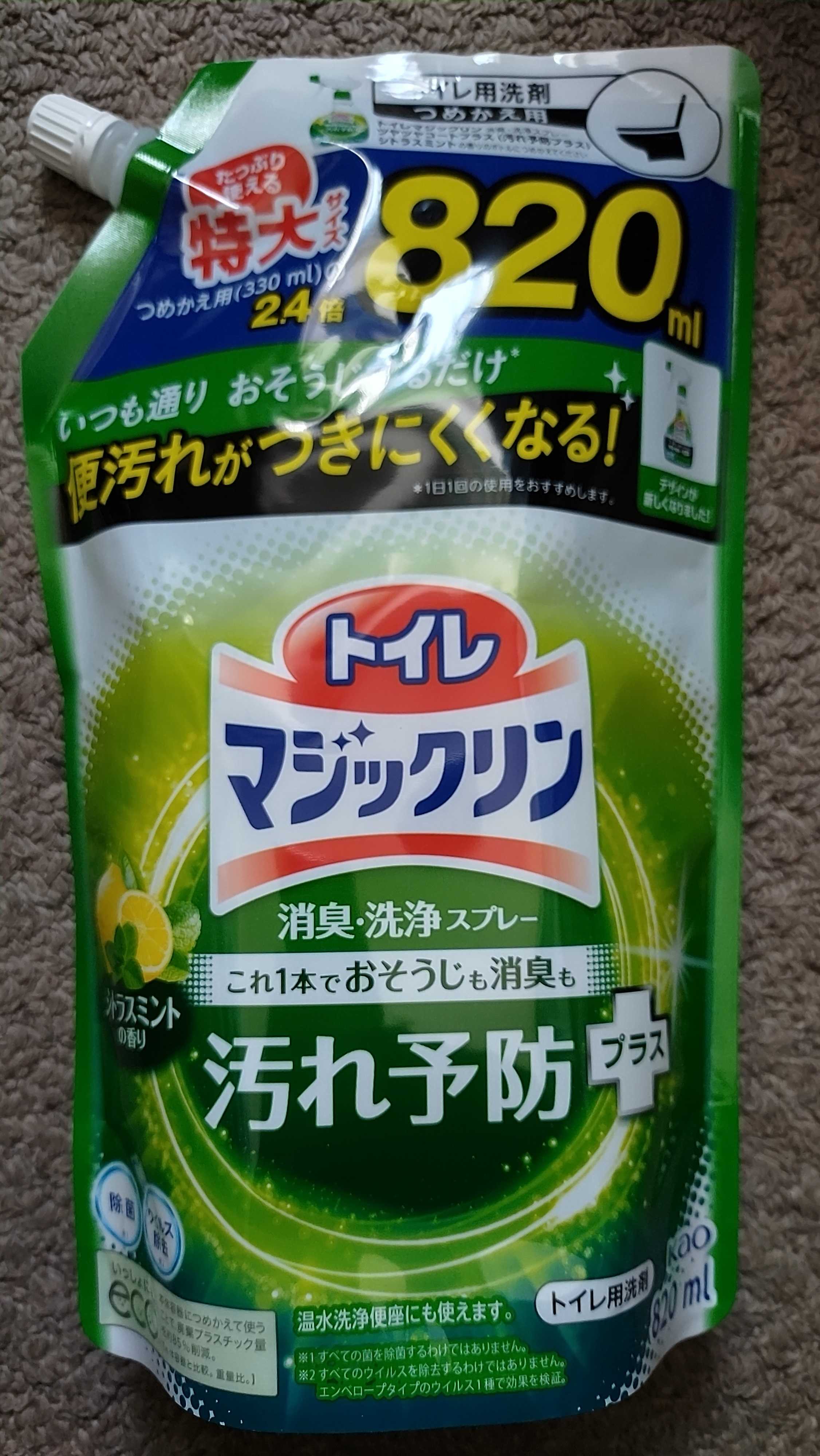 トイレマジックリンの詰め替えです。汚れが綺麗に落ちて香りもさわやかなので使っています。水垢なども付きにくくなってトイレが綺麗に保てています。