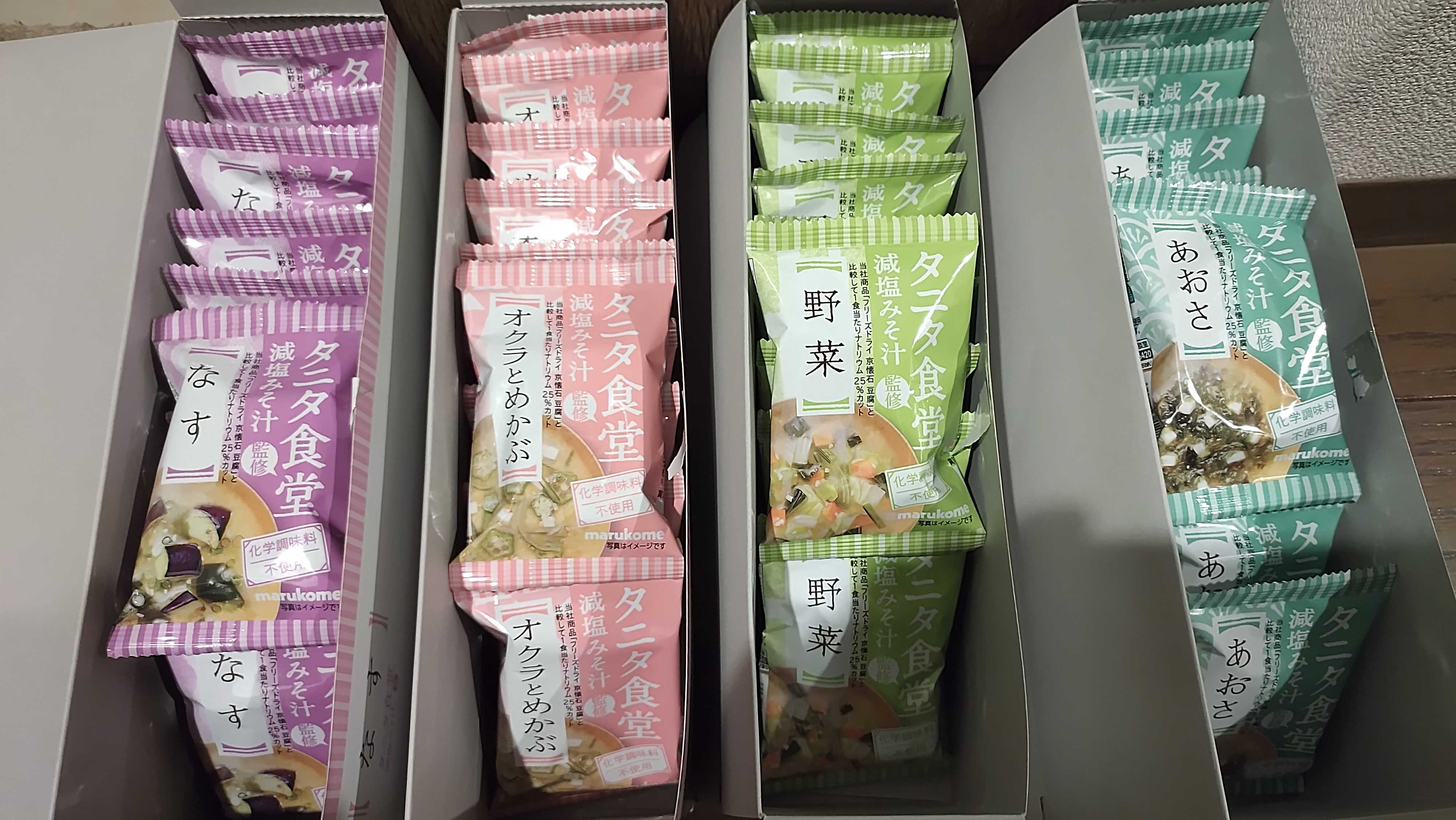 タニタ食堂監修の減塩味噌汁です。4種類からそれぞれ10食選びました。減塩なので体に優しく味も美味しくしっかりしています。お湯を注ぐだけなので時短になります。減塩みそ汁 なす 10食 ⇒ ゴロゴロ茄子と出汁がとても美味しいです。減塩みそ汁 野菜 10食 ⇒ 野菜多めで繊維質たっぷりです。減塩みそ汁 オクラとめかぶ 10食 ⇒ オクラとめかぶのねばねばが美味しいです。減塩みそ汁 あおさ 10食 ⇒ あおさの香りと食感が美味しいです。