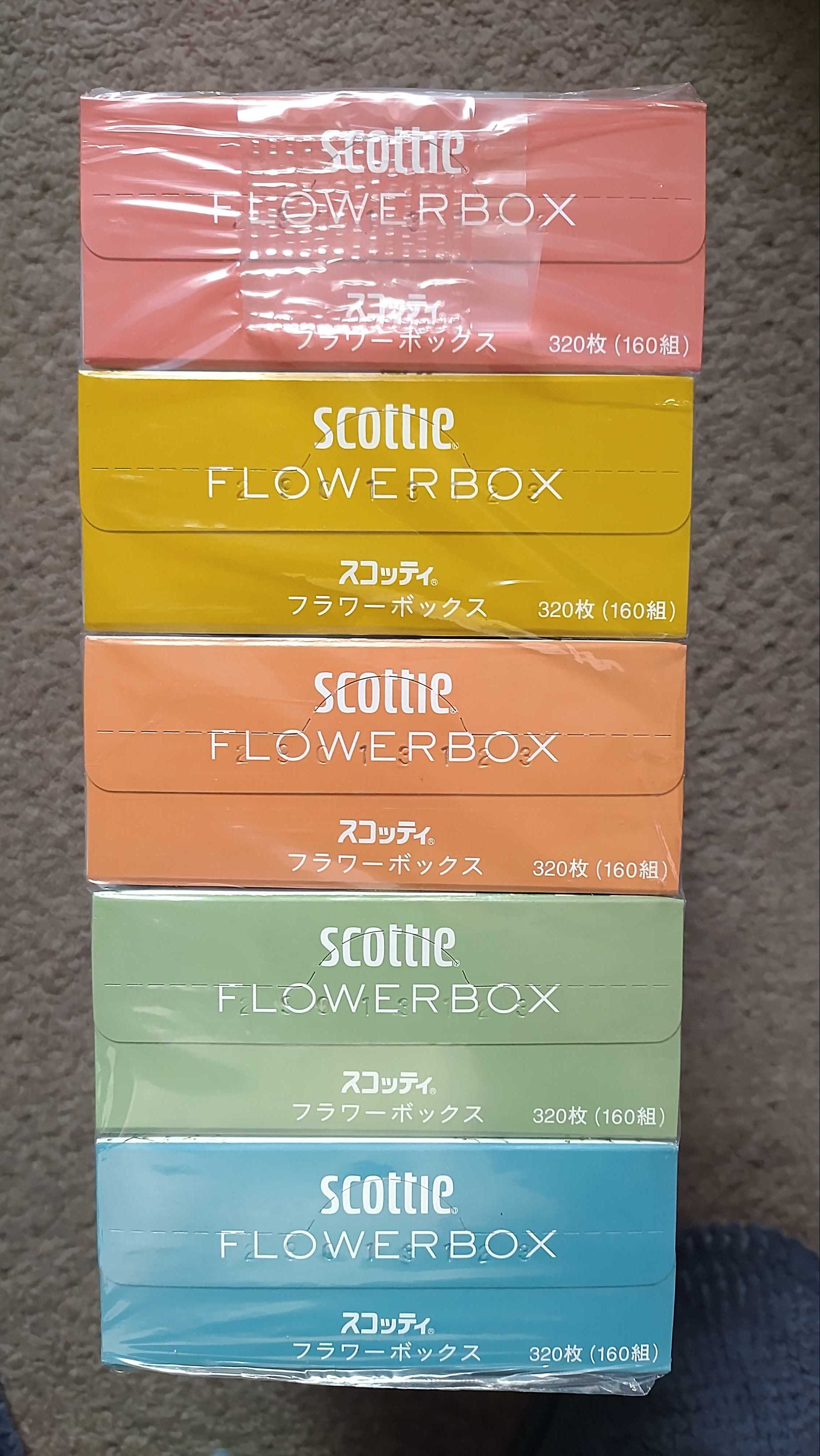 カラフルのフラワーボックスのティッシュが楽しいです。複数の場所に置いているので5箱セットはありがたいです。紙質も良いので重宝しています。無くなると困るティッシュです。