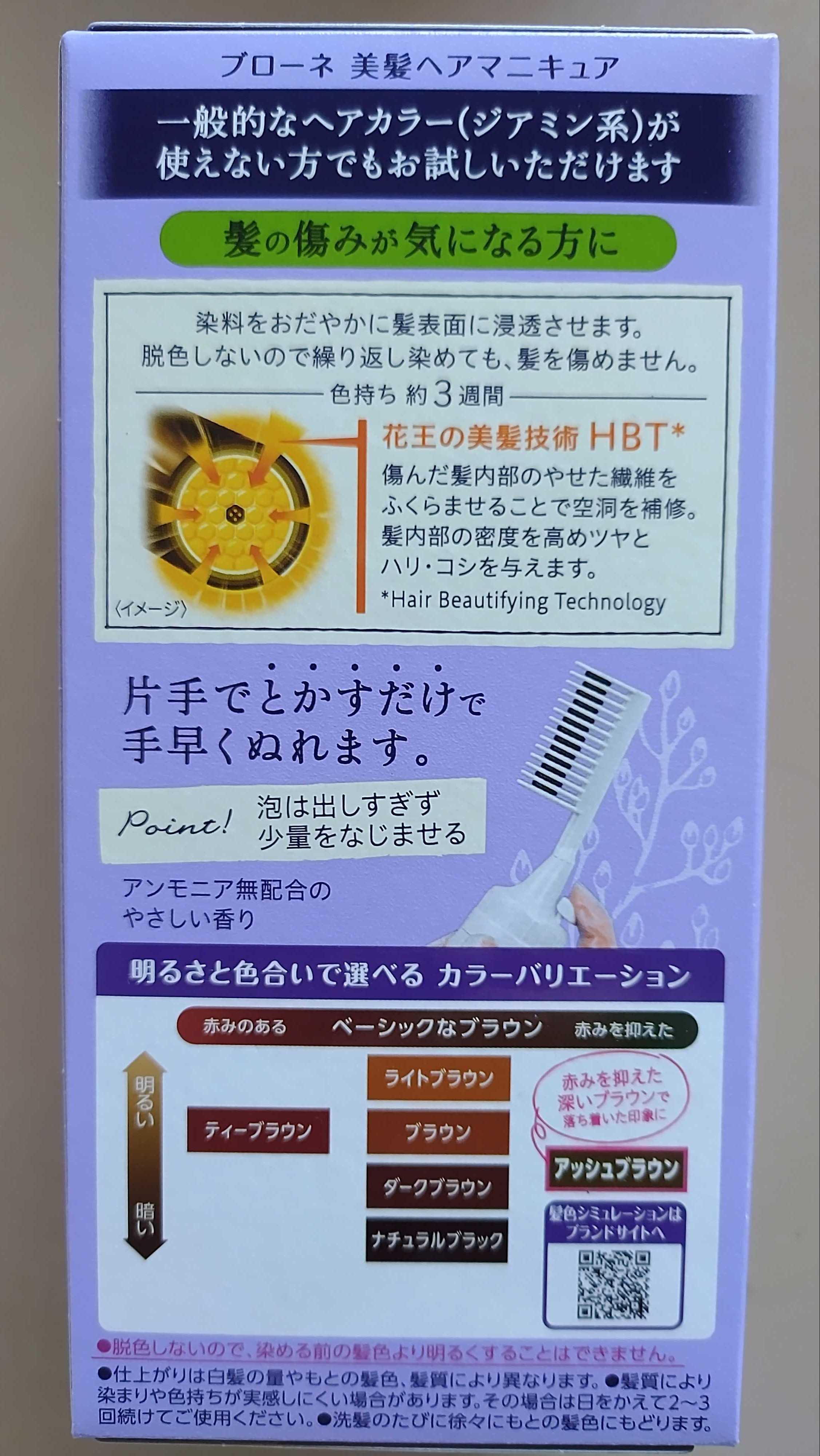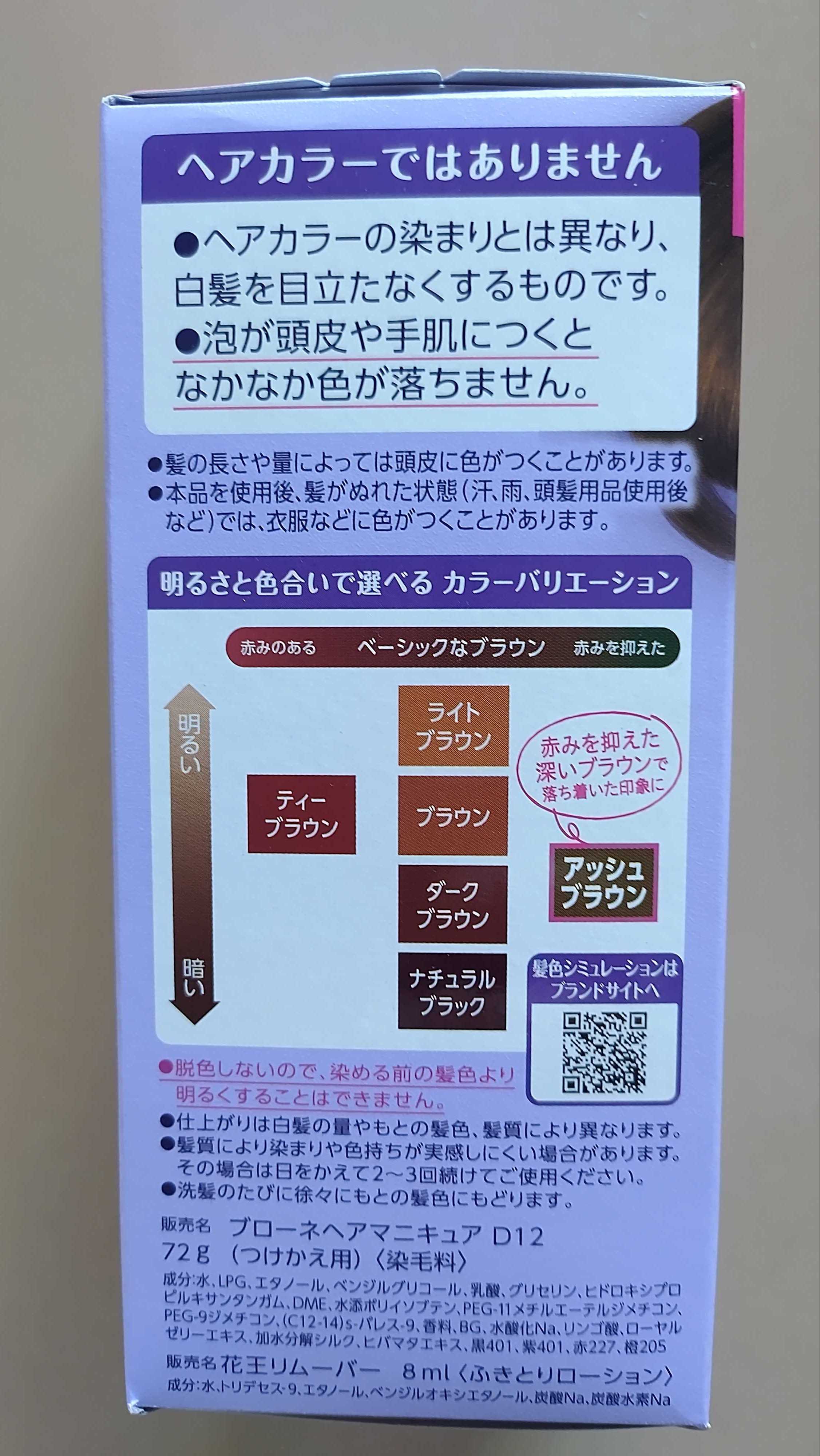 しっかり染めるのは刺激が強いので、このヘアマニュキアを愛用しています。色はアッシュブラウンで赤みが強くはないです。地肌にマニュキアが付くと、専用の液でふき取る役の私が大変です。
