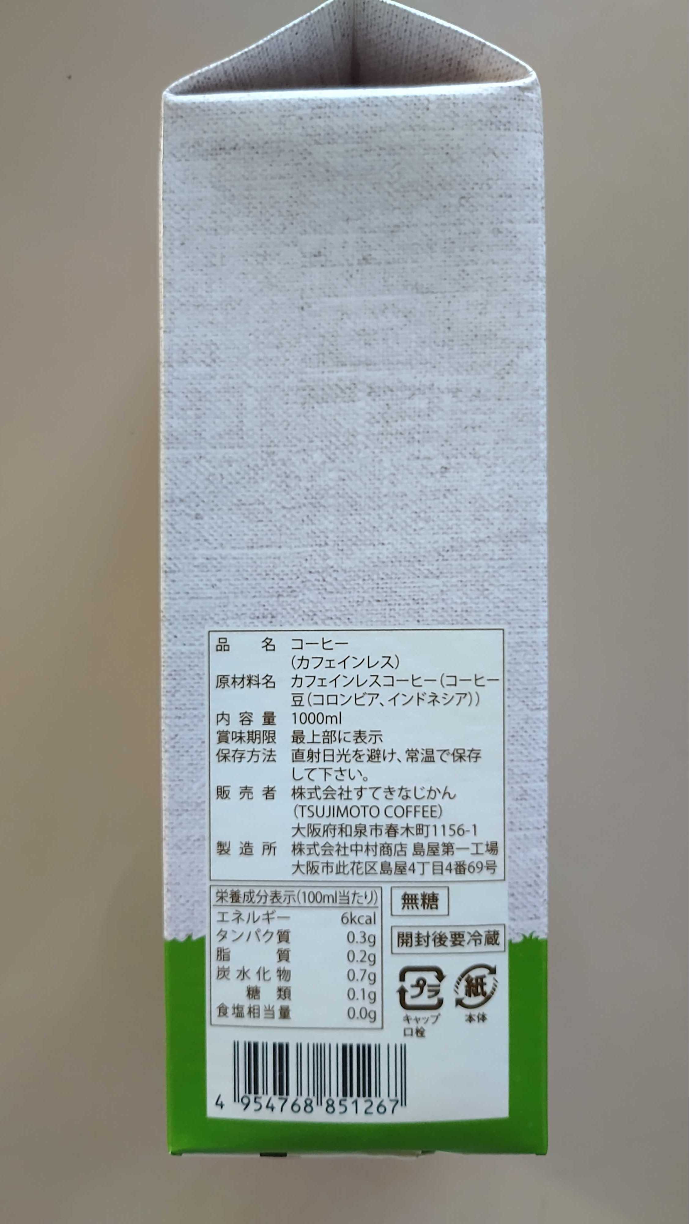 ノンカフェインのコーヒー1リットル入り6本です。ノンカフェインですがコーヒーの香りが良いので、大人から子供まで、カフェインが苦手な方や妊婦さんにもお勧めです。我が家では、牛乳とか豆乳で割って飲んでいます。