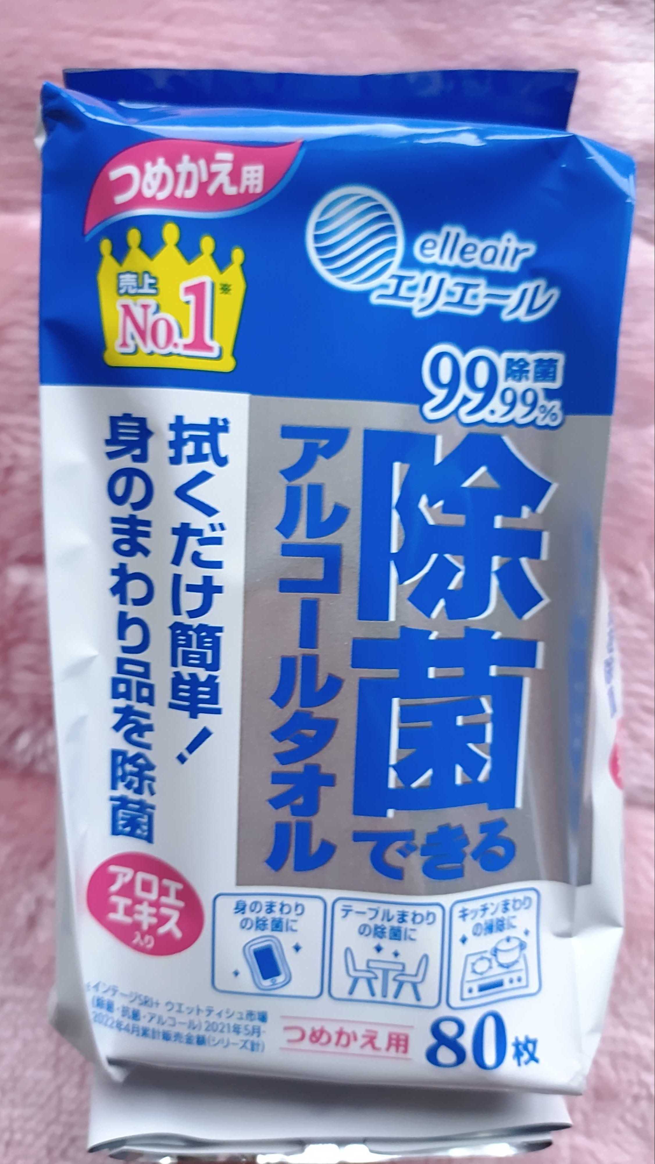 丸い入れ物に入れているウェットティッシュの詰め替え用です。テーブルの上に置いて、汚れたものを拭いたりしています。これからもしばらく除菌が必要な時期でなのでテーブルに常備しています。