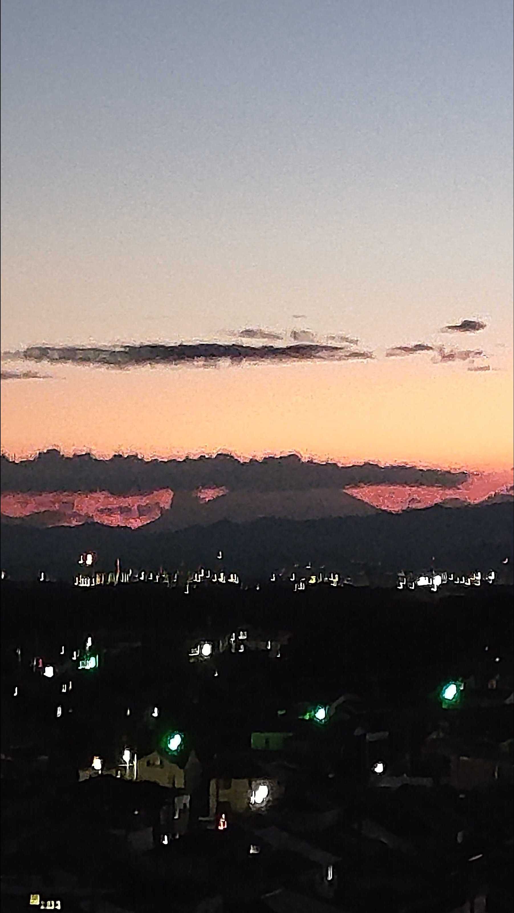 🗻がはっきりと見えます。🌕は昨日6:00頃に沈んだのですが、今日はまだ見えています。↓🗻 右の端に🌕