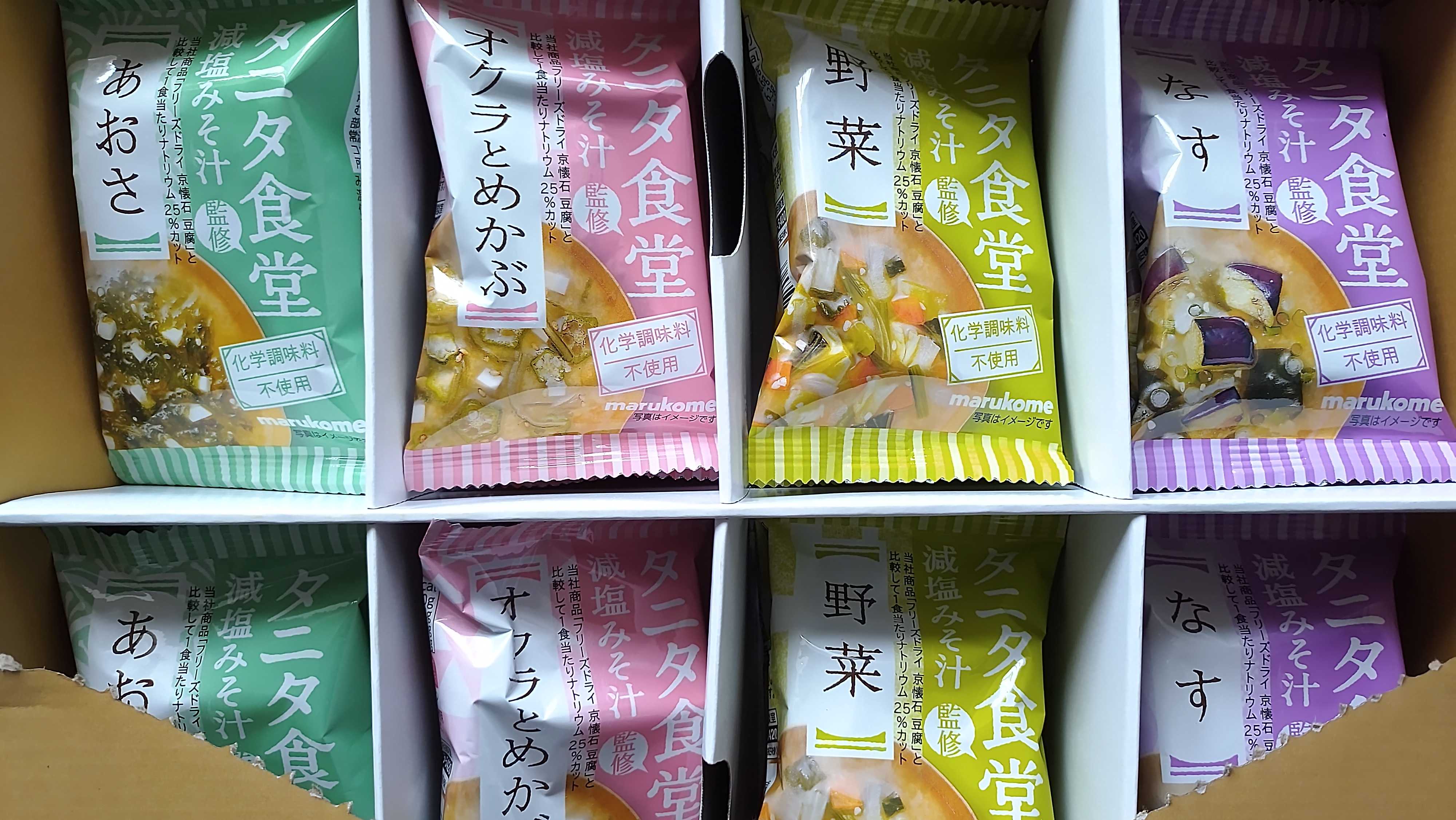 フリーズドライの減塩味噌汁です。お湯を注ぐだけで美味しい味噌汁が完成します。あおさ、なす、野菜、おくらめかぶと4種類入っています。私はあおさを増したりワカメを入れたりして頂いています。