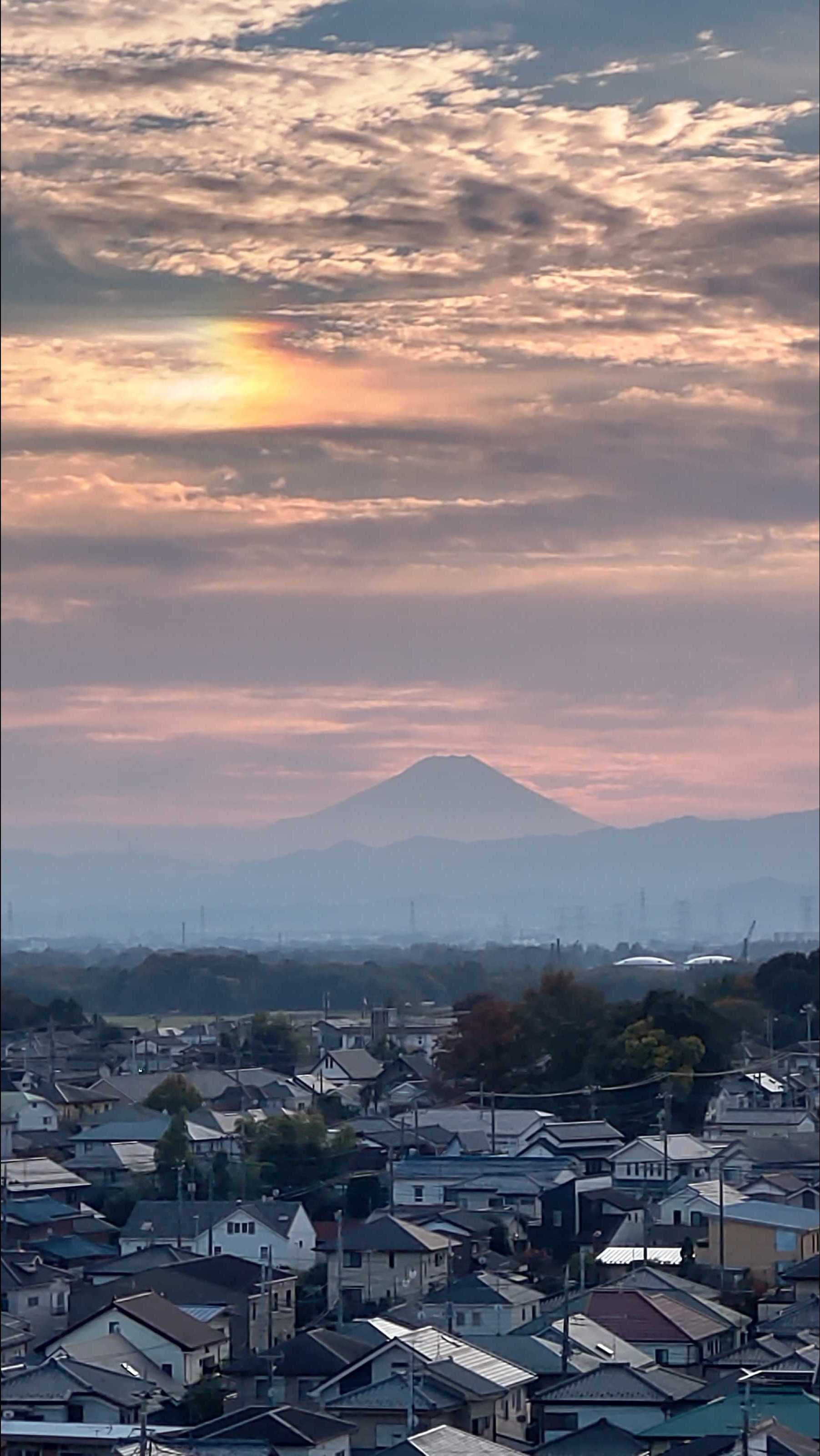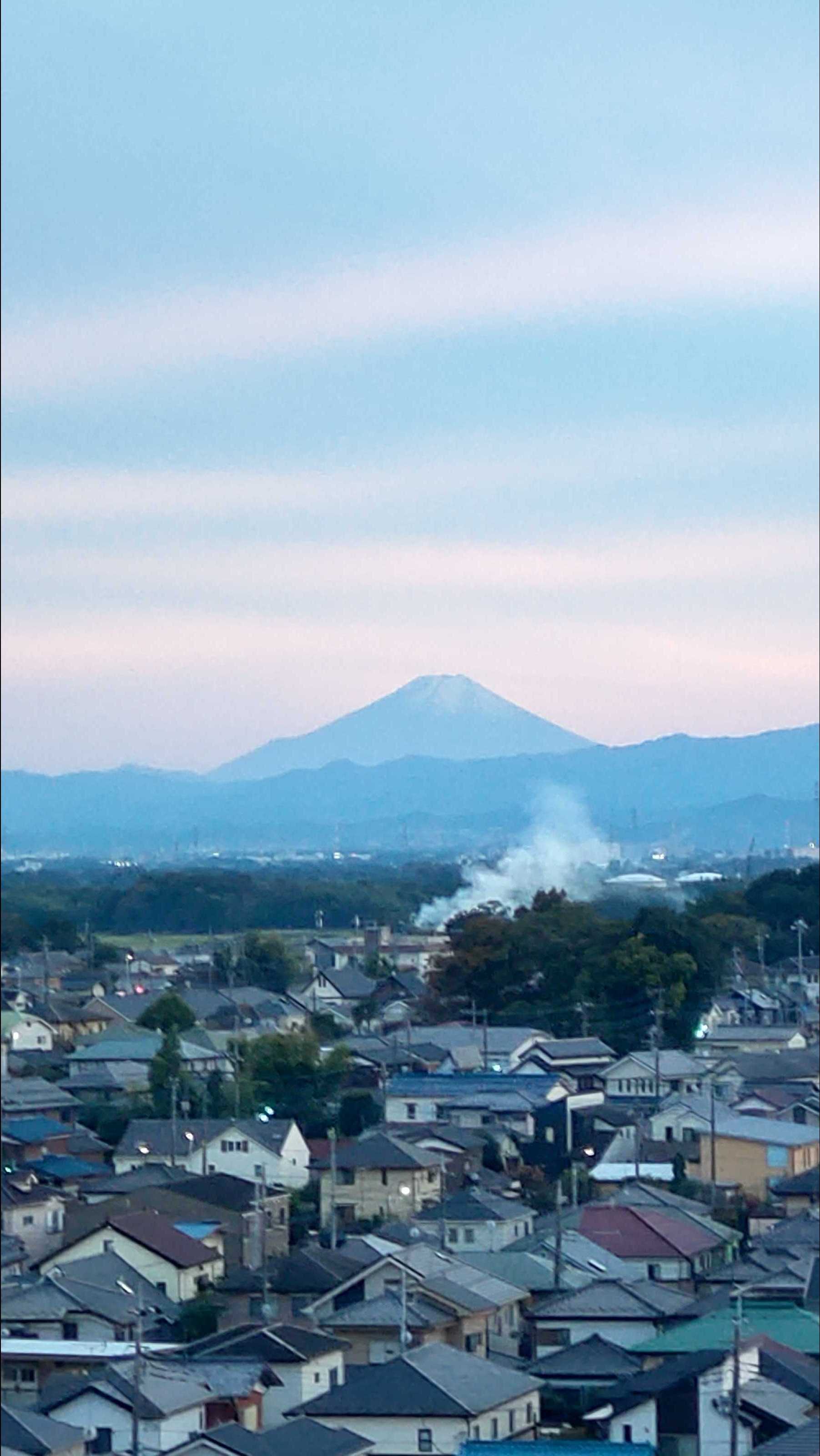 本日の夕暮れの🗻は夕日が雲に隠れているのでこのような景色です。手前の煙は火事ではなく野焼きです。風のない日はこのような光景がそこかしこで見られます。16:40