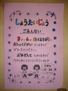 おとといイチヒメからもらったこんな招待状。年長さんのみのイベントで、お母さん達をおしょくじかいにご招待してくれるというもの。本当は先日の懇談で先生からこっそり聞いていましたが、大げさなくらいに喜んで招待状を受け取り、今日出かけてきました。子供達が作ってくれたのはこのおにぎり。それに給食のおばさんが作ってくれたおかずが付いていました。我が子の作ってくれたおにぎりを食べる幸せ。そして最後にはお母さんへのメッセージカードも頂いて・・今日もやはりあちこちで涙するママ達の姿がありました。食事の後は30分程度親子でぬりえ・毛糸あそび・お絵かき・ゲームなどから好きな物を選んで一緒に遊ぶ時間だったのですが、ニタロウが時間切れって感じで愚図り始めてしまい・・教室内のあちこちへ私の手を引っ張って歩き回るため、ほとんどイチヒメの相手が出来ませんでした。イチヒメは仕方なく他の親子の遊んでいる所へ行って話しかけたり、最後は机で黙々とお絵かきをしてました。その様子を見てたらさすがにイチヒメに申し訳なくなっちゃいましたこういうとき、やっぱり下の子をちょこっと預かってもらえると楽ですよね。私の場合実家は無理だから、そうなると託児だよね、なんて思いながら帰りの車を運転していたら、ラジオからショッキングなニュースが帯広市内の無認可保育所が不適切行為で改善勧告を受けたそうです。道内では初めてのことらしいです。平手で頭を叩いたり、寝ている子供の顔にバスタオルをかぶせるなどの行為があったとか。この保育所を実際利用したことはありませんが、以前無料託児付きの美容院へ行ったとき、そこで託児をしてもらった保育士さんが、この保育所から派遣されてきた方でした。もちろんその時はなんの問題もなく、イチヒメもニタロウも帰りたくないというくらい楽しかったみたいだけど。経営者の方もだいぶ反省しているようなので、今後の保育改善をぜひ願いたいものです。