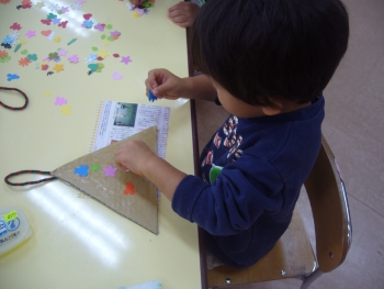 4月からニタロウが通う幼稚園は、第1,3,5土曜日が「自由登園日」となっています。今日は在園児の土曜日活動に一緒に参加出来る日でした。年少~年長までが縦割りでいくつかのグループに分かれ、そこに未就園児も参加するという形。歌を歌ったり、工作活動をしたりしました。工作はツリーにいろんな形をぺたぺたと貼り付けて・・この時期、この手の作品を作る機会が多いので、家にたくさん飾ってあります