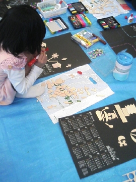 近くのショッピングモールで開催された「遊びの学校」に子供2人と参加してきました。遊びの学校は幼児と小学生の為の造形教室みたいなもので、毎月開かれていることは知っていて興味があったのですが、参加するのは今回が初めて。今日は色々な形の木片を使って来年のカレンダーを作るというのがテーマ。木片を自由に組み合わせて好きな絵柄を作成し、ポスカやスパンコールを使ってさらに装飾していきます。イチヒメはもともとこういうのが大好きですが、今日はニタロウもなかなか独創的?なものを作っていました。遊びの学校は無料で参加でき、スタッフの方もとても親切。来月も参加しようと思ってます