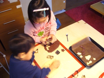 特に予定もない日曜日。午後からはダンナも仕事へ出かけてしまったので、暇つぶし&おやつ作りということで、子供2人にクッキー作りをさせました。プレーン生地とココア生地を用意し、1回目はそれぞれを型抜きし、2回目は生地を合わせてマーブルにしてみました。 型抜きはクリスマスを意識して、ひいらぎやツリー、ブーツなどを中心に。焼き上がったそばからどんどん食べる2人。凝ったケーキより、こういうシンプルなお菓子が子供は好きなのよね。型抜きもすごく楽しそうにやっていました。子供向けのお菓子教室とかやってみたら楽しいかも
