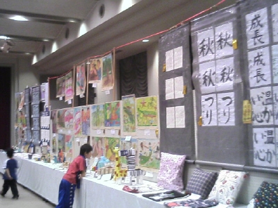 先週から今週にかけて、「市民文化祭」という催しがありました。そのひとつとして、市内の小中学生が学校の授業で作った(書いた)作品から選抜されたものが、文化センターのホールに展示されています。 イチヒメの工作も選ばれて展示され、しかも金賞を頂きましたさまざまな空き箱を使って動物を作るというテーマだったようで、イチヒメの作品は「親キリン子キリン孫キリン」のキリン3段重ねです。 小学校高学年や中学生になると大人顔負けの手芸作品などもあって、なかなか見応えのある展示でした。