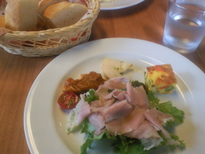 ダンナが有給休暇を取っていたので、お昼はランチへ出かけました。お目当ての店が残念ながら定休日でしたが、こちらのお店もとても美味しくて満足でした。前菜3種盛り合わせ。キッシュが熱々で美味しかった。ピザ生地をフライパンで焼いて具をはさんだサンドイッチ。中のモッツァレラチーズがすっごく美味しくて、どこのメーカーか聞きたいくらいでした。デザートも3種類の盛り合わせ。ひとつひとつ丁寧に作られてる印象。しゅわしゅわ感のあるムースなど、ちょっと変わった味も美味しかったです。