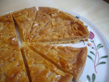 タルトリングにシュクレ生地(クッキー生地)を敷き込んでから焼きし、キャラメリゼしたスライスアーモンドを流し込んでさらに焼きます。