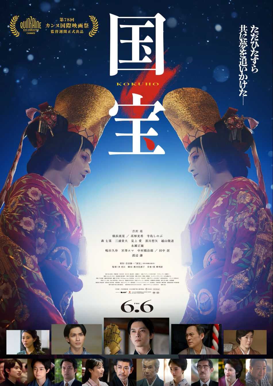 「俺、お前の血が欲しい」(喜久雄=花井東一郎=吉沢 亮)「芸があるやないか」(俊介=花井半弥=横浜流星)(前回のブログの続きです)ストーリーに入る前に、登場人物の相関図を貼り付け、簡単に登場人物を紹介します(主役の2人は前回のブログで紹介しましたので、今回は脇を固めるキャラクターと俳優を紹介することにします)★花井半二郎(渡辺 謙):上方歌舞伎の大名跡、主人公の一人、花井半弥(横浜流星)の実父です。渡辺 謙は、日本を代表する国際的大スターで、アメリカ映画「ラスト・サムライ」でトム・クルーズと共演、また。クリント・イーストウッド監督の「硫黄島からの手紙」では、栗林中将を演じて観る人に感銘を与えました。映画の花井半二郎は、「連獅子」で立役(男役)を演じ、「曽根崎心中」では女形の「お初」を演じようとする。半二郎は立役、女形の二刀流だったようだ?(花井半二郎=渡辺 謙)★大垣幸子(寺島しのぶ):花井半二郎の妻、花井半弥(横浜流星)の母親です。役名の苗字が「大垣」となっていますのは、花井半二郎の本名の苗字が「大垣」だからなのです。尚、息子の花井半弥の本名は「大垣俊介」なのです。寺島しのぶは、前回のブログで紹介した七代目尾上菊五郎と藤 純子の娘ですが、両親と違って「汚れ役」も辞さない演技派女優なのです。(大垣幸子=寺島しのぶ)★小野川万菊(田中 泯):人間国宝の女形です。女形の万菊を見事に演じた田中 泯は、昭和20年生まれの舞踊家(ダンサー)・振付師です。俳優業は、平成14年に公開された山田洋次監督の初の本格的時代劇「たそがれ清兵衛」(真田広之主演)、この映画で、57歳(当時)にして、数々の新人賞を受賞しました。(小野川万菊=田中 泯)★梅木(島田久作):歌舞伎の興行を仕切る興行会社「三友」の社長です。(写真右が梅木=島田久作)異様に長い顔、容貌魁偉、昭和63年公開の映画「帝都物語」の魔人役が忘れられない。(映画「帝都物語」のポスター)★吾妻千五郎(四代目中村鴈治郎):上方歌舞伎の大御所、映画の後半で喜久雄と駆け落ちする彰子の父親、四代目中村鴈治郎は、本物の「人間国宝」であり、この映画の「歌舞伎指導者」としてスタッフとしてもこの映画に関わりました。父は四代目坂田藤十郎(三代目中村鴈治郎、初名は二代目中村扇雀)、母は扇千景です。(吾妻千五郎=四代目中村鴈治郎)★福田春江(高畑充希):喜久雄の長崎での幼な馴染み、喜久雄に惚れ込み、喜久雄と「対の刺青」を入れます。喜久雄を追って大坂に来て、喜久雄の成長を見守る、この映画のヒロインです。高畑充希は今、人気絶頂の「旬の女優」です。(福田春江=高畑充希)★藤駒(見上 愛):祇園の舞妓(芸妓)、喜久雄が祇園の茶屋で遊んだ際、喜久雄に一目惚れし、後に喜久雄の愛人となり、一人娘の「綾乃」を産む芸妓です。見上 愛は、来年のNHK朝ドラ「風、薫る」の主演が決まっている2000年生まれの新進女優です。(藤駒=見上 愛)★綾乃(滝内公美・たきうち・くみ):喜久雄と藤駒の間に生まれた子供です。成長してカメラマンになり、人間国宝になった喜久雄を取材します。★彰子(森 七菜・なな):吾妻千五郎の娘、映画の後半で、喜久雄と共に大阪から出奔して、ドサ回りの旅に出ます。(彰子=森 七菜)<スト―リー>花井半二郎に引き取られた喜久雄は、花井東一郎という屋号(芸名)を与えられ、半二郎の息子・俊介(屋号=花井半弥)と共に厳しい修行の末に、若手人気女形として成長していきます。2人共、女形なのだ。ちょっと危険。2人が共演で演じる演目は、先ずは「二人藤娘」です。(二人藤娘)歌舞伎舞踊「藤娘」は、絵から抜け出した「藤の精」が娘姿で踊るという、歌舞伎舞踊の人気の演目です。2015年に公開された松竹シネマ歌舞伎「二人藤娘/日本振袖始」(演出:坂東玉三郎)では、坂東玉三郎と中村七之助の「二人藤娘」を観ることが出来ます。以下にこの映画の予告編の動画を貼り付けますので、興味のある方はクリックしてご覧くださいね。<シネマ歌舞伎「人藤娘/日本振袖始」予告編>次の共演演目は、「二人道成寺」です。(二人道成寺)「京鹿子娘道成寺」は、和歌山県日高町にある古刹「道成寺」に伝わる「安珍・清姫伝説」を基にした歌舞伎舞踊です。「安珍・清姫伝説」の概要は、「思いを寄せた僧の安珍に裏切られた清姫が蛇に変化して日高川を渡って追跡し、道成寺で鐘ごと安珍を焼き殺す」というものです。2007年に公開されたシネマ歌舞伎「京鹿子二人道成寺」(演出:坂東玉三郎)では、坂東玉三郎と尾上菊之助の「二人道成寺」を観ることが出来ます。以下に「予告編」の動画を貼り付けますので、興味のある方はクリックしてご覧くださいね。<シネマ歌舞伎「鹿子二人道成寺」予告編>2人の共演とは別に、師匠の花井半二郎は、息子の俊介(花井半弥)との共演で「連獅子」を舞います。(花井半二郎の「連獅子」)「連獅子」は、歌舞伎舞踊の代表的な演目の一つで、「獅子(ライオン)は生まれたばかりの我が子を深い谷に落として、そこから