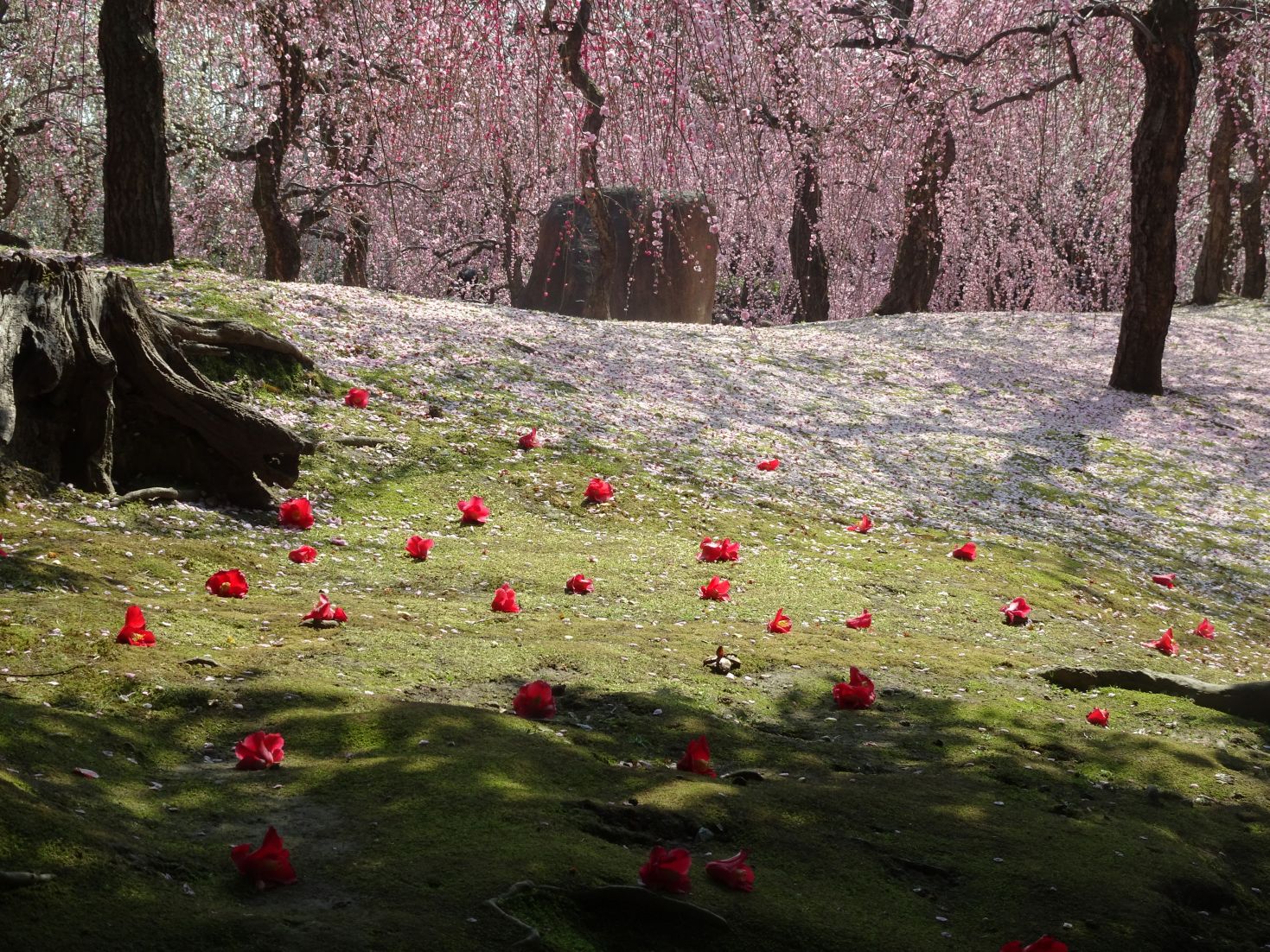 枝垂れ梅の花の下に配置された散り椿、「城南宮」の「春の山」、まさに極楽浄土だ!3月21日、今年最後の「梅行脚」という事で、京都市の南にある「城南宮」にリュウちゃん1人でお出掛けしました。「城南宮」へ行くのは、今回で2度目になります。初めて行ったのは2022年でしたので、今回は「3年ぶり、2度目」のお出掛けということになります。2022年には、3月10日にお出掛けしたのですが、今回は、前回より11日遅い「お出掛け」になりました。今年は梅の見頃が、例年よりも2週間位遅い。前回よりも11日遅い「お出掛け」だが、まだ「枝垂れ梅」は見頃の筈だ?午前9時、奈良の家を出発、午前11時過ぎ、京都駅に到着、「城南宮」に行く前に、京都駅ビルの中にある大衆割烹「がんこ」で、少し早い昼食、プファ~、ビールが旨い!、寿司も旨い!「城南宮」の梅祭り、22日で終わりのようだが、どんな姿を見せてくれるのだろうか?「京都駅」から「城南宮」までは、直通バスもあるようなのですが、今回は混雑するバスを避けて、タクシーで行ったのです。「京都駅」から「城南宮」まで、タクシー代が3200円!、ちょっと大散財だ!午後12時30分、「城南宮」に到着、鳥居を潜ります。おお、本日の目的だった「枝垂れ梅」と「椿」、両方共、「見頃」だ!入口の梅の花も、見頃だ!<「城南宮」について>「城南宮」は、京都市伏見区中島鳥羽離宮町にある神社です。創建の詳細は不明ですが、西暦794年の「平安遷都」の頃に創建されたようです。「城南宮」の名称は、「城」平安京)の南に位置する所から来ているようです。11世紀後半、白河天皇が「鳥羽離宮(城南離宮)」を造営した時に、「城南宮」は離宮の一部になったようです(ここの町名、鳥羽離宮町」は、この事が由来のようです)幕末の「鳥羽・伏見の戦い」では、ここが主戦場となり、荒廃したようですが、昭和43年に再び「城南宮」として復活したようです。「城南宮」は、150本の枝垂れ梅と、150種類の椿が咲く「花の神社」として有名です。以下の図は、「城南宮の境内図」です。「枝垂れ梅」は以下の図の左上の「春の山」に植えられています(「春の山」は、「神苑」の一部なのです)、「椿」は、「神苑」内に点々と植えられています。「神苑の作庭」は、昭和30年代に、「昭和の小堀遠州」と称された作庭家・中根金作氏によって設計・施工されましたので、まだ造られて60年ほどの「若い庭園」です。枝垂れ梅、椿も、皆、若木なのだ。(城南宮の境内図)以下のサイトは、「城南宮のHP」です。ここには、「枝垂れ梅」「椿」の他にも、「城南宮」の歴史などが詳しく書かれていますので、興味のある方はクリックしてご覧下さいね。<城南宮のHP(しだれ梅と椿まつり)>「神苑」に入場します。「椿」は「神苑」の道筋の横手に、列をなして植えられています。例に拠りまして、品種別の椿の写真を出来るだけ撮影しましたので、「枝垂れ桜」の前に、椿の品種別の写真を以下に貼り付けます。椿の品種名、バラと違って、殆どが日本古来の和名なのだ。<蝦夷錦><有楽(うらく)(太郎冠者)><鹿児島><玉之浦><源氏車><紅侘助><曙(あけぼの)><藪椿><玉唐子(たまからこ)><与一><七曜変化><越の月光(こしのがっこう)><千代の春><春の曙><太陽錦><月譚(げったん)><花冨貴(はなふうき)>フ~、やっと17種だけ、写真を撮ることが出来ました。本日の椿、「見頃」とは云え、開花期がマチマチなので、150種の椿を全部撮影しようとすれば、4~5回足を運ばなければ不可能だと痛感したのです。尚、以下のサイトには150種の椿が写真付きで紹介されていますので、興味のある方はクリックしてご覧下さいね。<「城南宮」の椿図鑑(150種400本)><「春の山」の150本の枝垂れ梅>「張の山」の150本の枝垂れ梅のゾーンに入ります。アチャ~、入口の表示は「見頃」となっていたのに、実際は「落花盛ん、終りかけ」だ。地面は花の絨毯が敷きつめられている。でも、花の絨毯も風情がある。この「風情」を楽しんでみよう。<散り椿と枝垂れ梅のコラボ>「春の山」の枝垂れ梅の一番の見所は、「赤い散り椿と枝垂れ梅のコラボ」なのです。この「散り椿」、多分、自然落花したものではなく、人工的に配置されたものだと推測されますが、「散り椿」と枝垂れ梅、絶妙の配置!夢のように幻想的な光景だ!「春の山」を退出して、出口にある「平安の庭」に入りました。「平安の庭」にも、枝垂れ梅が咲いていた!ーーーーおまけーーーー<リュウちゃんの家の庭に咲く春の花>以下の写真、いずれも3月末に撮ったものです。<雪柳とレンギョウ>雪柳とレンギョウの後ろにある白木蓮は、殆ど落花してしまいました(残念!)<木瓜><寒アヤメ>「寒アヤメ」も木蓮の花びらに覆われています。<沈丁花><水仙>「白い水仙」は殆ど3月中旬なでに終ってしまいました。<黄水仙>こちらは「咲き始め」でした。<クリスマスローズ><ハナニラ><ムスカリ>そして、<乙女椿>リュウちゃんの家の庭の「乙女椿」、「城南宮」のどの椿よりも清純可憐