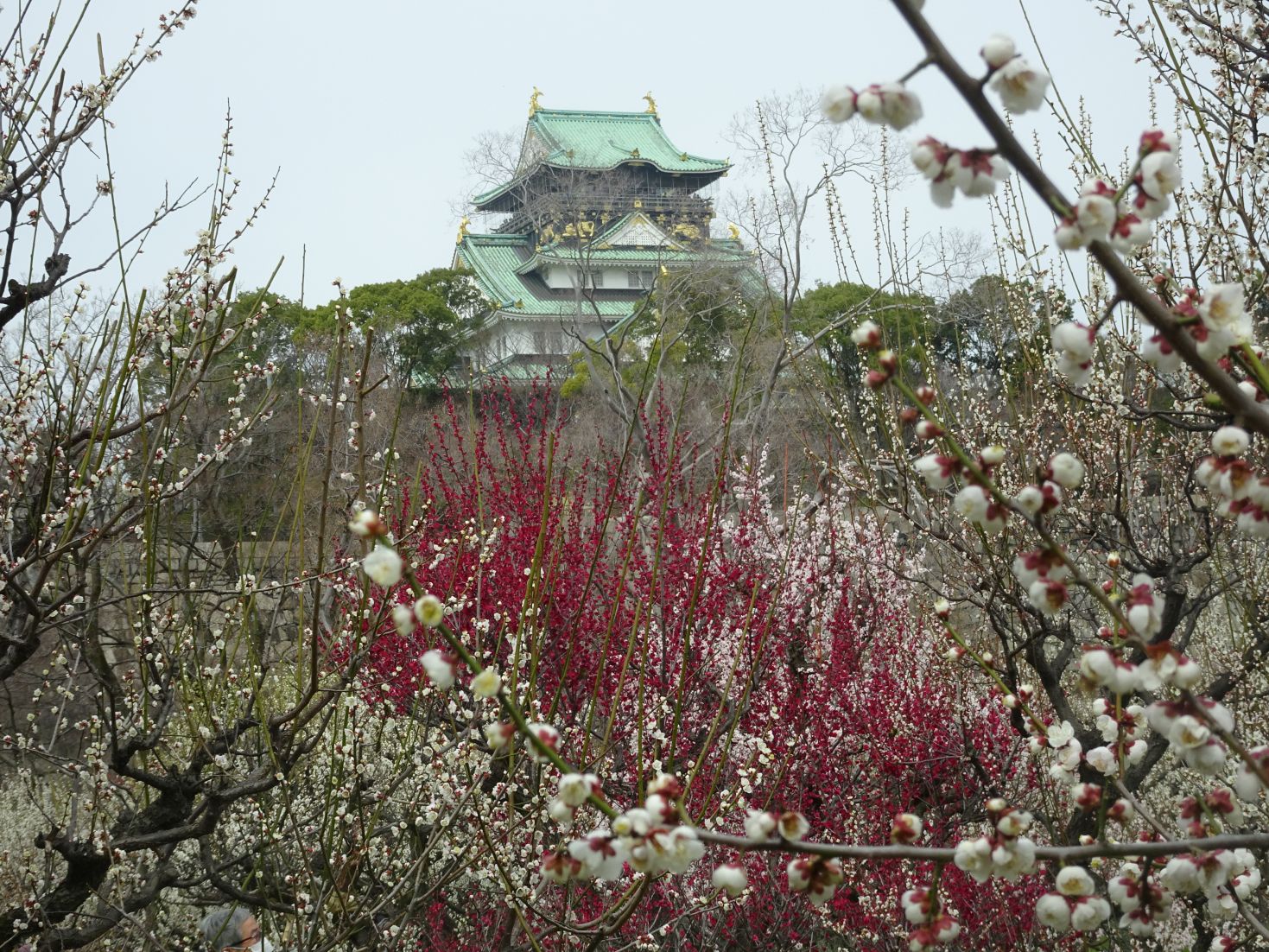 今年初めての梅林散策、「大阪城梅林」、やっと「見頃」になった。3月13日、今年初めての梅林散策に出掛けました。今年は、特に関西では冬の寒さのためか、梅の開花が例年より20日くらい遅れていました。例年なら2月中旬に「開花宣言」をする「大阪城梅林」も、今年の開花宣言は、「3月初旬」になってしまったのです。開花宣言から約10日経った。そろそろ「見頃」の筈だ?ということで、3月13日に「大阪城梅林」に出掛けて見たのです。奈良のリュウちゃんの家から大阪城梅林まではJRで約1時間で行けます。朝8時30分、家を出発、9時30分、梅林の最寄り駅、「JR大阪城公園前」に到着。大阪城の外堀付近には、菜の花と木瓜の花が咲いていた。外堀には、水鳥も泳いでいた!二の丸の北にある「青屋門」から入城します。「青屋門」の近くから見上げた天守閣、やはり凄い威容だ!北口(出口?)から梅林に入ります。おお、北口から遠目に見える梅林、ほぼ満開だ!梅林の様子です。天守閣を見上げる大阪城梅林、水仙も満開なのだ!<大阪城梅林について>「大阪城梅林」は、昭和49年、大阪府立北野高校の卒業生が開校100周年の記念事業として、22品種、880本の梅に木を大阪市に寄贈したことで、開園しました。開園51周年を迎える現在、梅林には105品種、1245本の梅が植えられているのだそうです。以下のサイトには、「大阪城梅林」に植えられている全品種が写真付きで紹介されていますので、興味のある方はクリックしてご覧くださいね。<特別史跡「大阪城公園」―梅林―>それでは、ここから、この日撮ることが出来た梅の品種を順に紹介して見ます。<南高梅>梅林の入口にある白梅、和歌山県みなべ町で算出された品種で、果実(梅の実)は、最高級品種と云われています。<一重緑萼><一重野梅><武蔵野>日本の梅の中で、一番大きな花を付ける品種。<八重唐梅><八重緑萼><豊後(ぶんご)><鹿児島紅><古城><白加賀>金沢の加賀潘邸に植えられていた白梅、果実としては前出の「南高梅」に次ぐ生産量があるようだ。<八重揚羽><うなじ小町><中国梅><江南><道知辺(みちしるべ)>大阪城梅林の2025年の梅。花形の整ったピンクの梅です。暗い夜道でも、「道しるべ」の役割が果たせるほどに香りが強く、また、わずかな月明りでも目印になる花であることから命名された。ここの「道知辺」、まだ「咲き始め」だ。<紅千鳥><月の桂><玉拳(ぎょっけん)><初雁>まだ「蕾」、<黒雲>黒紅色の八重の中輪です。<東錦><夫婦梅枝垂><思いのまま>一本の梅の木で、紅白2色の花を付ける品種です。<鶯宿><楊貴妃>豊後系のピンクの大輪の梅の花です。園内の説明文の立札には、「枝にあふれるように大輪の花をつける。天に向かって伸びる枝が楊貴妃の立ち姿のよう。名前のとうり艶やかな八重の紅梅」と書かれています。この梅、上手く撮ることが出来ませんでしたので、以下にネットからお借りした「鮮やかな立ち姿の楊貴妃」の写真を貼り付けます。「楊貴妃」の美をカメラに捉えることは、「至難の技」なのだ。(ネットからお借り」した「楊貴妃」)フ~、やっと25種類の梅の花を紹介することが出来ました。「大阪城梅林」を退出したのが正午少し前、JR環状線「京橋駅」まで行き、駅前の商店街にある鮮魚店「大起水産」で昼食、プファ~、ビールが旨い!海鮮丼のネタもとびっきり新鮮だ!ここは「大阪城梅林」の至近距離、梅の香りが漂ってくるように思われる。午後1時過ぎに「大起水産」を後にして、次の目的地である「道明寺天満宮」の梅園に向かいました。「道明寺天満宮」は、大阪府藤井寺市にある菅原道真を祀る神社で、梅園には80種800本の梅が植えられているのです。梅園の入口のところで、「盆梅展」が開催されていました。規模としては、「長浜盆梅展」などには遠く及ばないが、丹精された小品の「盆梅」は心に残る。「思いのまま」の小盆梅、見事に紅白に咲き分けている!「梅林」に入ります。この梅林は、品種名が全く表示されていませんので、以下、何枚か写真を貼り付けるのみと致します。品種名が表記されていないと、手も足も出ない(情けなや~)梅園の奥手の巨大クスノキ、幹周5,8m、樹高23m、圧巻の巨樹だ!