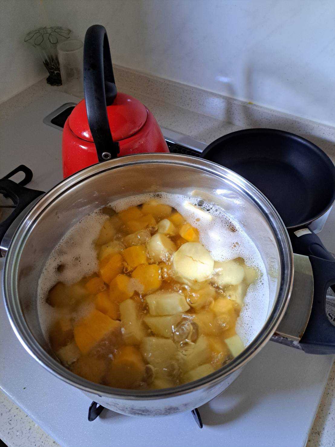 沢山収穫出来たサツマイモですが半分以上が虫食いの跡がある状態なのでとても他人にお裾分け出来る程のものでない・・・・本当に残念な結果になった今年のサツマイモそこでお菓子(デザート)の状態に調理してお裾分けに出来ないかと考えましたスイートポテトは出来上がりを冷凍保存しておくことも可能と分かったのでスイートポテトを作ることにしました小さい芋や細い芋や虫食いの芋を綺麗に洗って皮を剥き悪い所は大目に切って取り除き大きさを揃えて切ってまずは茹でます鳴門金時と安納イモの両方を使いました黄色味が強いのが安納イモです竹串が通る位に柔らかくなったら、水気を切って鍋の中でつぶしその後弱火で竹べらでかき混ぜながら水分を飛ばしますそこへ分量の牛乳、バター、砂糖を入れて良く混ぜ合わせます一旦火を止めてから卵黄を入れてバニラエッセンスも好みで入れます粗熱が取れたら、ラグビーボール型に丸めて飾り用の卵黄を刷毛で塗ってからクッキングシートを敷いた天板に乗せて余熱ありで200℃のオーブンで20分焼いたら出来上がりですお隣の家にお裾分けしました今日も4歳の女の子と5歳の男の子はとても元気で奥さんもハキハキ元気で、少しの時間でしたがとても楽しくおしゃべりしました喜んでくれて良かったです次は大学芋に挑戦しようと思います