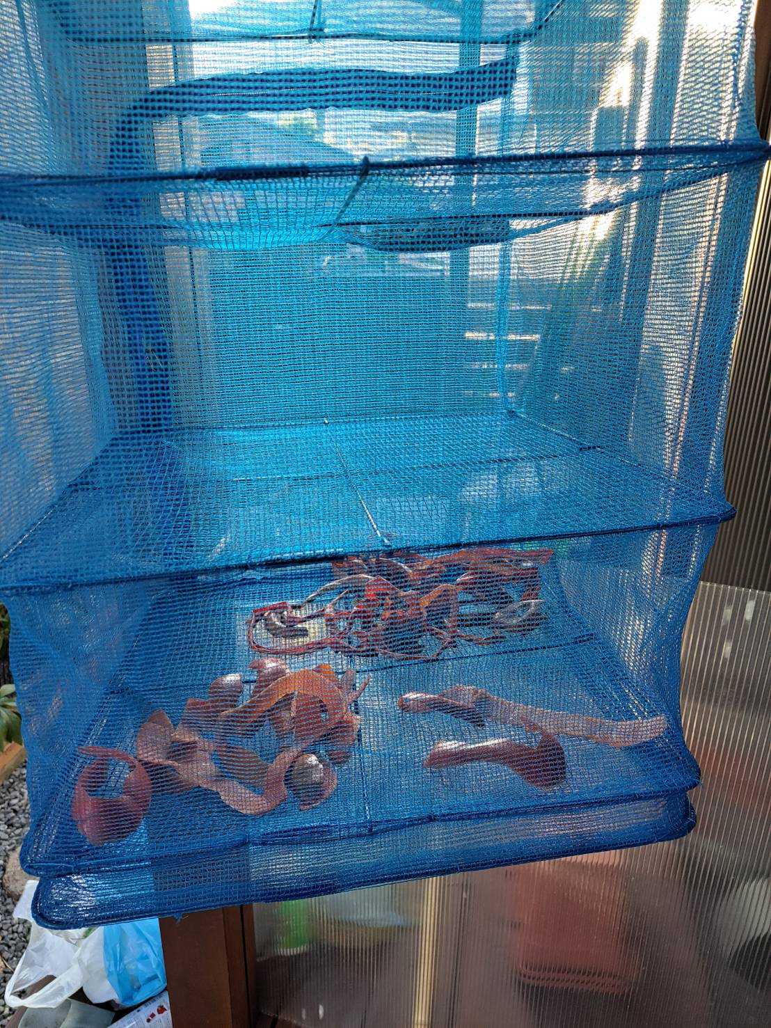 毎年野沢菜漬けを漬ける時に、柿の皮も一緒に入れています甘味や旨味を出す効果があると聞いていて昔から母たちも入れていたので野沢菜を買う時に一緒に探して柿の皮を購入していましたでも、去年この柿の皮を探すのに結構苦労してしまいました何か所かの道の駅で探したんですが見当たらずで、諦めていた時偶々昼食に立ち寄った野沢菜の産地から遠く離れた道の駅でようやく見つけたのでしたそんな経緯もあり、今年の野沢菜漬けの為の材料調達ルートはわざわざその道の駅に寄らねばならない・・・ルートを考えていた程です所が考えてみれば、今柿のバイトに行っているおっちゃんは柿を大量に頂いて帰ってくるので一気に作ることは出来ませんが、一つ二つづつの柿の皮は生まれていますそこで前々から欲しかったこれを買いました三段のネット状の乾燥用の網籠・・・・梅干し 平干しネット 3段 天日干し ネット 干し網 干しかご 3段 ドライネット 干物 ネット 一夜干し 野菜 魚 乾燥 干し野菜 ドライフルーツ 乾物 折りたたみ 万能ネット 天日干し用ネット 天日干し 土用干し カゴ アミ 網 籠 ザル 乾燥 干し 自家製 果物これで、柿を食べる度に出る皮を入れて少しずつだけど乾燥させて柿の皮を作っておけばいいじゃないですか何でこんな簡単なことに気が付かず今まで苦労していたのか?おっちゃんは小さい物でも無駄な買い物が嫌いですなので、乾燥させるのなら山菜用に購入した茣蓙(ござ)があるやろ・・・あれに広げたらいいと、私が密かにキノコや大根を干すのにこれがあったら便利だろうなと思っていても購入を却下されてきました今回は、自分の大好きな野沢菜の為となったらOKサインが出ました本当に勝手なんです( ^ω^)・・・ぶぅぶぅおっちゃんの頭の中では、渋柿の皮が良いと思っていたようで甘柿の皮だと違うのか?がちょっと不安ではありますがおそらく大丈夫なはずですそして私は早速パックで売っていたシイタケを上段で乾燥・・・・上手くいきましたこれで、今年は大根のはりはり漬けも切った大根をネットで乾燥させて早めに作ってみようと思いますもっと早くに購入したら良かったと思った商品です