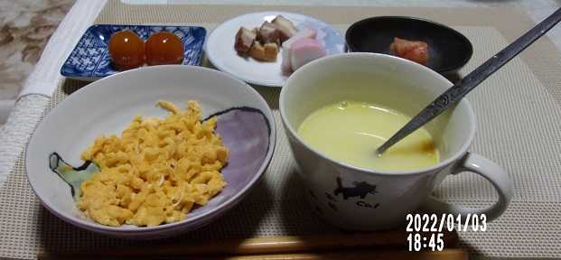S/E、コーンミルクポタージュ、カマボコ、金柑甘煮、辛子明太