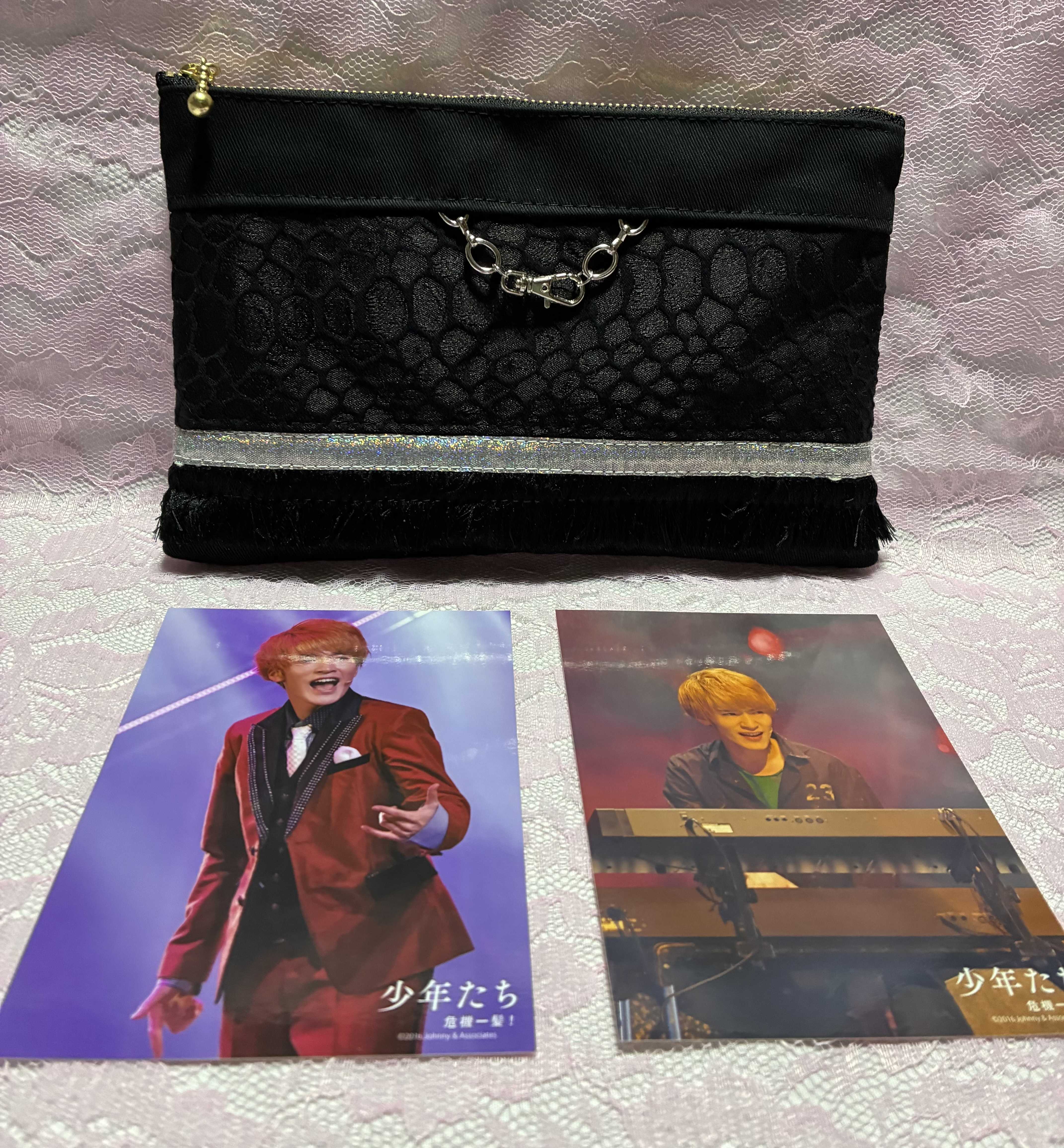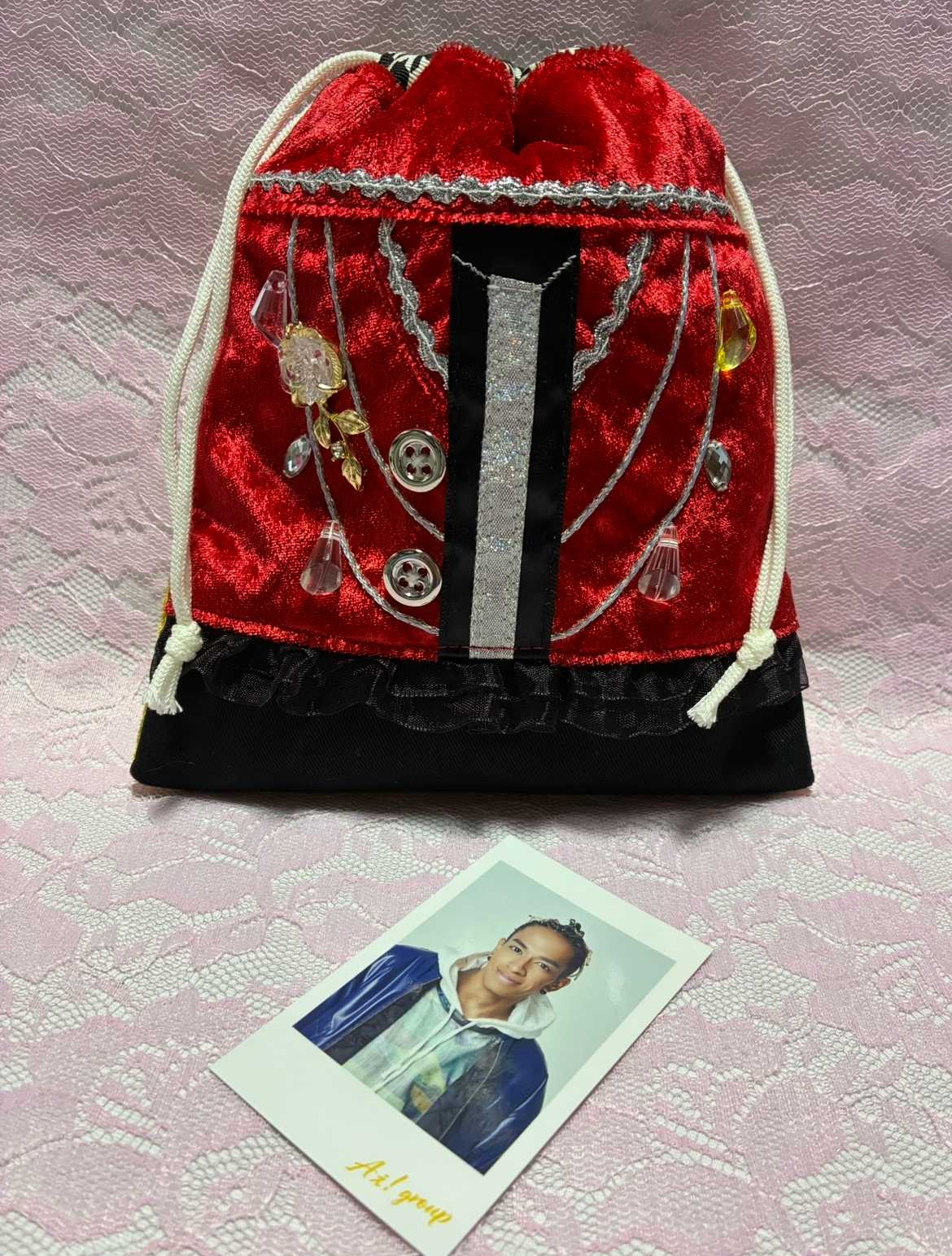 Aぇ! group 小島健💜くん♪PRIDE メンバーカラー 紫色 チェキ風カード写真色々、変えています。衣装巾着接着芯使用ミシン縫いと手縫いの作品です。接着剤使用なし。入れ口平置き 約17センチ縦 約20センチ表生地に接着芯を使っています。 表生地赤色ベロア生地黒色生地紫色ラメ生地千鳥格子生地 絞り口生地裏地紫色サテン生地飾り黒色グロブランリボン銀色山道テープ、銀色細リボンしずく形デザインカットビーズ葉形デザインカットパーツ白色バラ金色チャーム銀色ボタンヒモ紫色Aぇ! group末澤誠也、草間リチャード敬太、佐野晶哉、正門良規、小島健衣装ポーチ、衣装バッグ、キーホルダー、衣装巾着お化粧ポーチ、コスメポーチ、通帳ケースキーホルダー、チャーム、バッグチャーム 入れ写真ケース、デコケース 入れちびぬい、ぬい服、ちびぬい衣装、衣装風小物 入れ