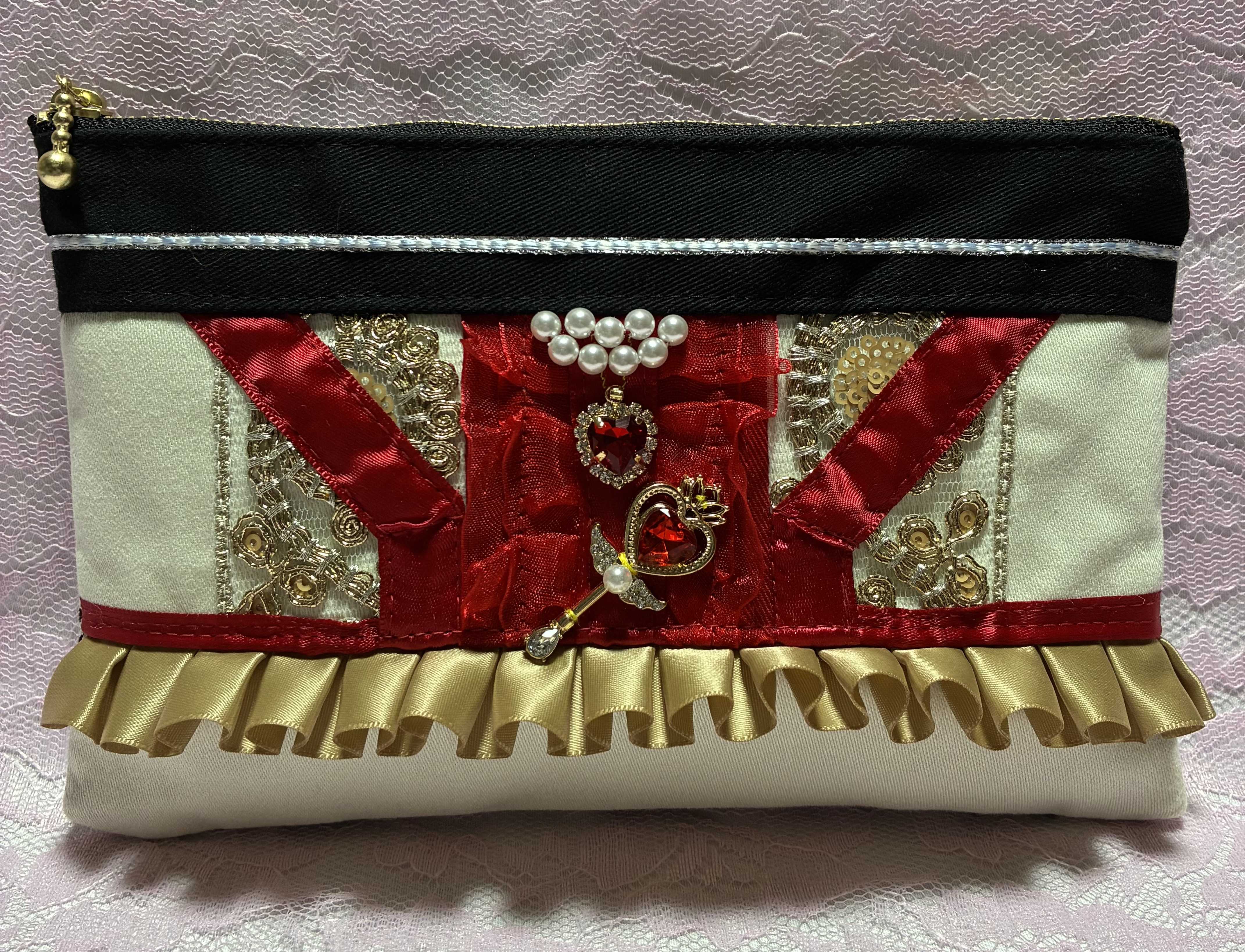 衣装ポーチハード接着芯使用ミシン縫いと手縫いの作品です。接着剤使用なし。Snow Man宮舘涼太❤️くん♪地球(あい)してるぜメンバーカラー 赤色色々、変えています。同じ物は作りませんので、1点物です。今回は、変身前を白黒花柄生地にしました。変身後をアイボリー生地にしました。ペンダントトップが、赤色ハート宝石です。ファスナー 20センチ縦 約13センチ表生地にハード接着芯を使っています。 表生地黒色生地赤色生地 中央縦に使用アイボリー生地白黒花柄生地裏地バラ柄生地飾り銀色細リボン赤色サテンリボン金色刺しゅうデザイン幅広リボン赤色オーガンジー2段フリルベージュフリルパールビーズ ビーズ刺しゅう縫い付け赤色ハート宝石チャーム、金色ビーズ、黄色1ミリ斜め飾りミシンステッチ赤色ハートステッキチャームSnow Man岩本照 深澤辰哉 宮舘涼太 佐久間大介 阿部亮平 渡辺翔太 目黒蓮 ラウール 向井康二衣装ポーチ、衣装バッグ、キーホルダー、衣装巾着お化粧ポーチ、コスメポーチ、通帳ケースキーホルダー、チャーム、バッグチャーム 入れ写真ケース、デコケース 入れすのチル ぬい服、すのチル衣装、衣装風小物 入れ