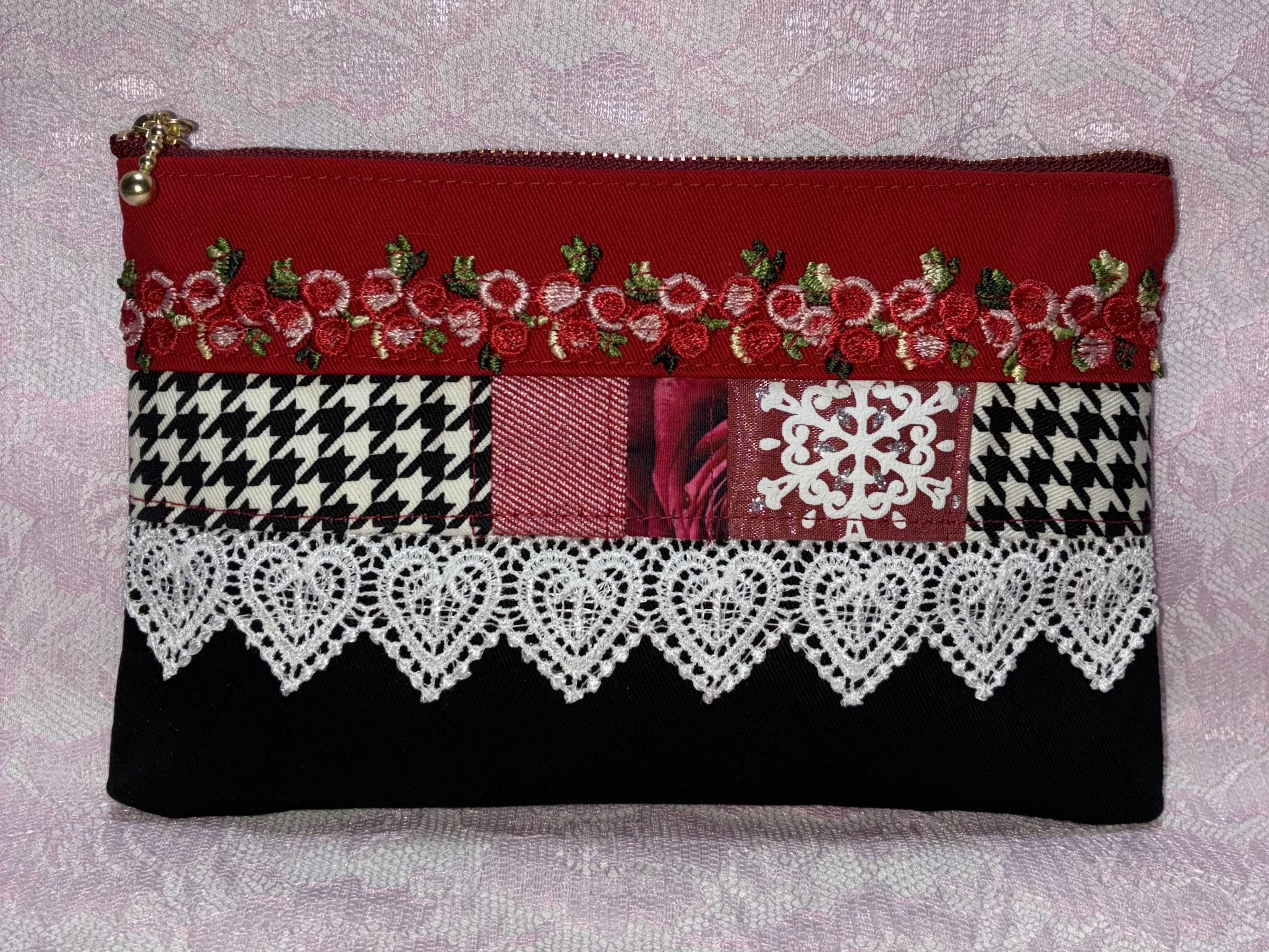 ポーチハード接着芯使用ミシン縫いと手縫いの作品です。接着剤使用なし。ファスナー 20センチ縦 約13センチ表生地にハード接着芯を使っています。 表生地赤色生地千鳥格子生地、赤ラメ生地、バラ生地雪の結晶オーガンジー生地と重ねて赤色生地黒色生地バラ柄生地裏地ベージュチェック生地飾りバラ刺しゅうリボン白色ハート刺しゅうレースSnow Man宮舘涼太 お化粧ポーチ、コスメポーチ、通帳ケースキーホルダー、チャーム、バッグチャーム 入れ写真、写真ケース、デコケース 入れすのチル ぬい服、すのチル衣装、衣装風小物 入れグッズ入れ