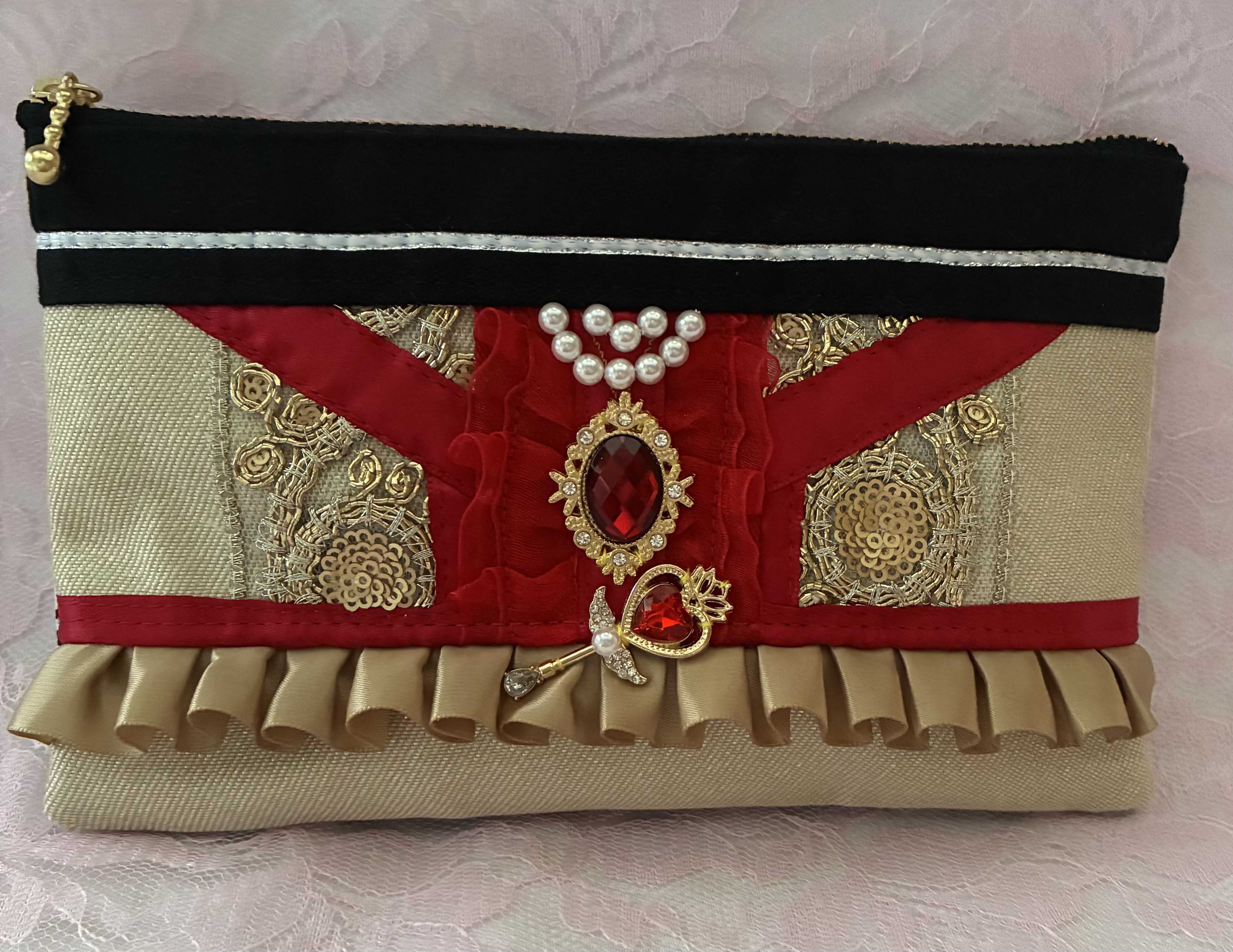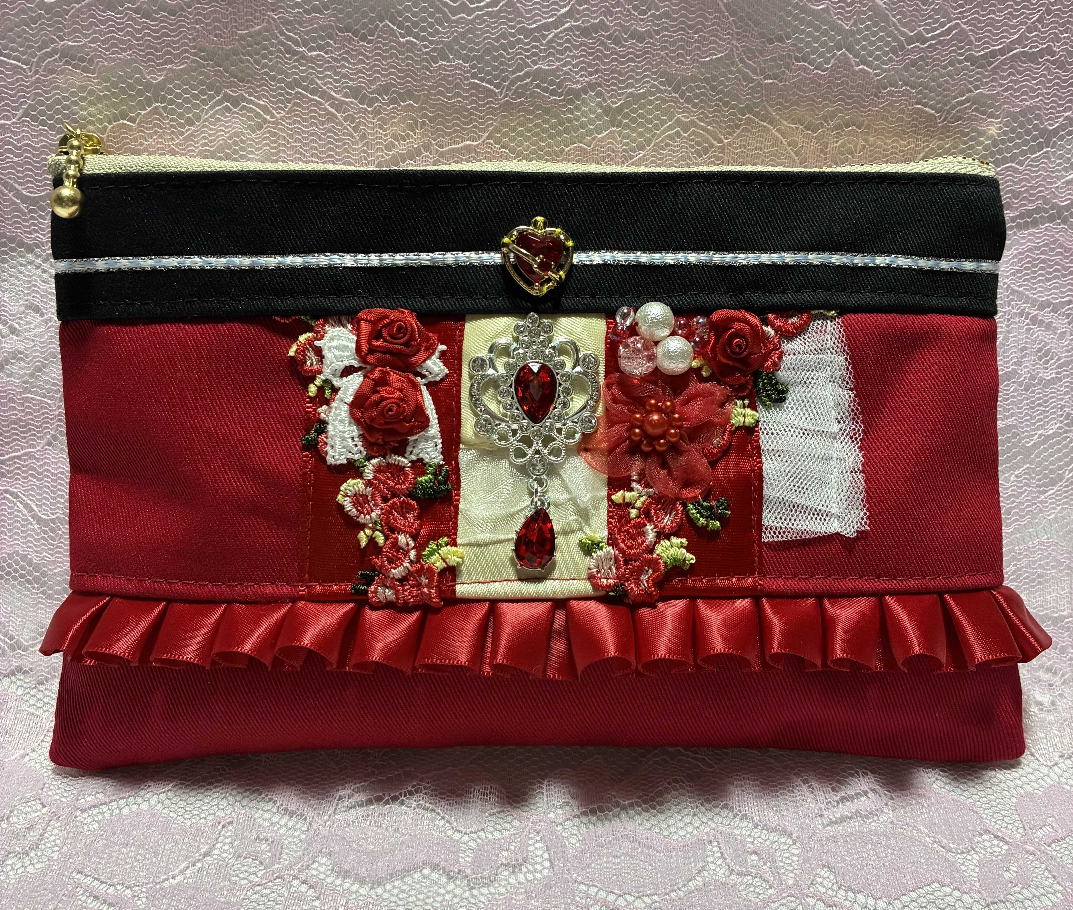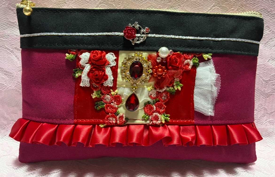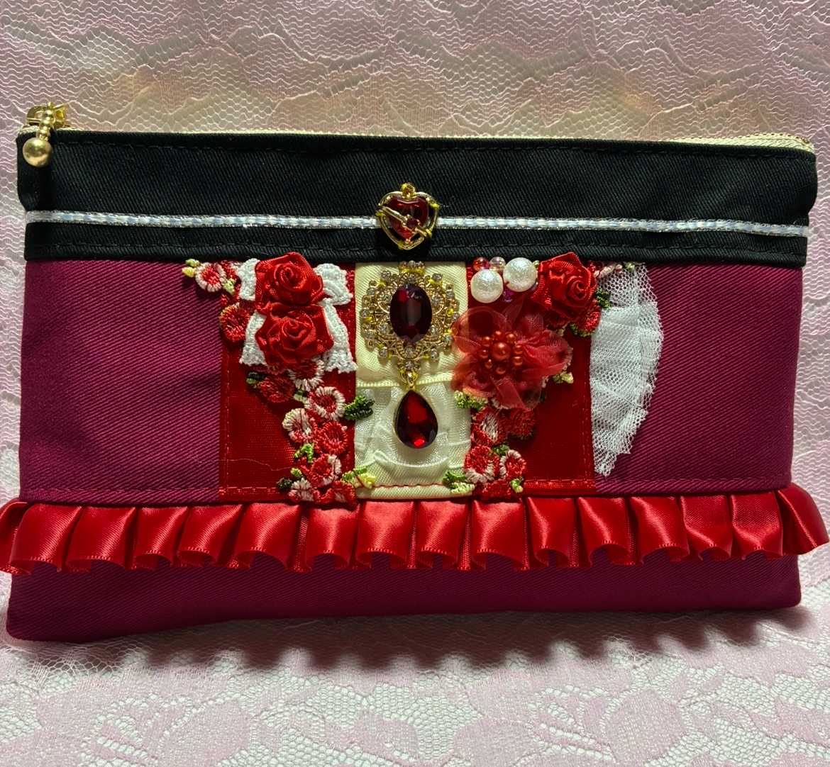 衣装ポーチ ハード接着芯使用 ミシン縫いと手縫いの作品です。 接着剤使用なし。 Snow Man 宮舘涼太❤️くん♪TRUE LOVE メンバーカラー 赤色色々、変えています。同じ物は作りませんので、1点物です。今回は、中央の赤色宝石飾りの銀色を使いました。ファスナー 20センチ縦 約13センチ表生地にハード接着芯を使っています。 表生地黒色生地赤色生地クリーム色バラ柄刺しゅう葉模様生地裏地千鳥格子生地飾り銀色細リボン、ハート赤色チャーム、金色ビーズ白色サテンリボン、白色2段オーガンジーフリル、赤色宝石チャームしずく形付き銀色ミニバラ刺しゅう葉付きリボン白色レース編みリボン形パーツ、バラパーツクリスタルビーズ透明・赤色、白色貝殻風パールビーズ、赤色透明クラッシュビーズ赤色オーガンジービーズお花パーツ、白色チュールリボン網赤色サテンリボン、赤色フリルファスナーベージュSnow Man岩本照 深澤辰哉 宮舘涼太 佐久間大介 阿部亮平 渡辺翔太 目黒蓮 ラウール 向井康二衣装ポーチ、衣装バッグ、キーホルダー、衣装巾着お化粧ポーチ、コスメポーチ、通帳ケースキーホルダー、チャーム、バッグチャーム 入れ写真ケース、デコケース 入れすのチル ぬい服、すのチル衣装、衣装風小物 入れ