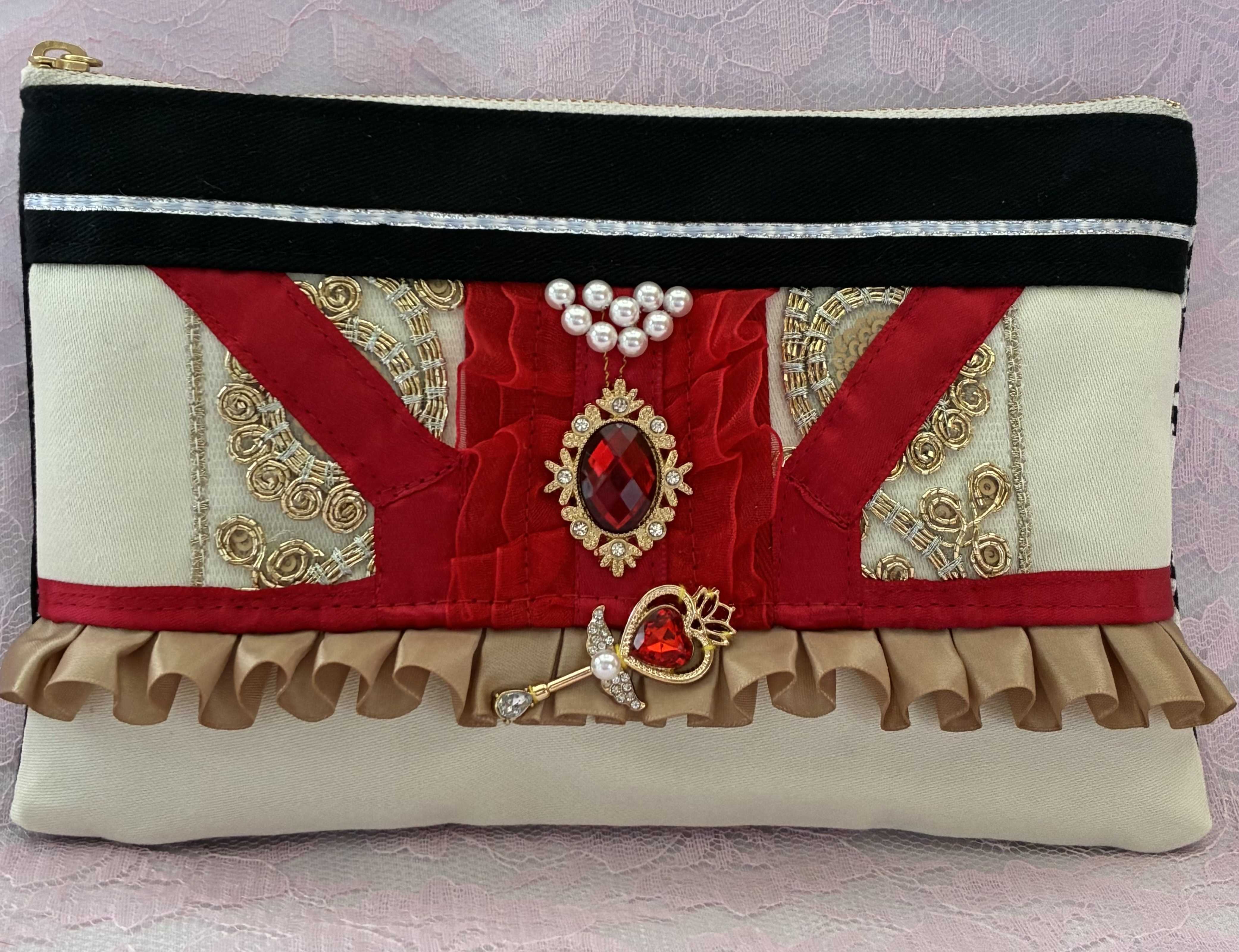 衣装ポーチ ハード接着芯使用 ミシン縫いと手縫いの作品です。 接着剤使用なし。 Snow Man 宮舘涼太❤️くん地球(あい)してるぜ メンバーカラー 赤色色々、変えています。同じ物は作りませんので、1点物です。今回は、変身前を白黒花柄生地で後ろ面、黒無地と切り替えにしました。変身後をアイボリー生地にしました。ファスナー 20センチ縦 約13センチ表生地にハード接着芯を使っています。 表生地黒色生地赤色生地 中央縦に使用アイボリー生地白黒花柄生地裏地バラ柄生地飾り銀色細リボン赤色サテンリボン金色刺しゅうデザイン幅広リボン赤色オーガンジー2段フリルベージュフリルパールビーズ ビーズ刺しゅう縫い付け赤色宝石金色チャーム、黄色1ミリ斜め飾りミシンステッチ赤色ハートステッキチャームSnow Man岩本照 深澤辰哉 宮舘涼太 佐久間大介 阿部亮平 渡辺翔太 目黒蓮 ラウール 向井康二衣装ポーチ、衣装バッグ、キーホルダー、衣装巾着お化粧ポーチ、コスメポーチ、通帳ケースキーホルダー、チャーム、バッグチャーム 入れ写真ケース、デコケース 入れすのチル ぬい服、すのチル衣装、衣装風小物 入れ