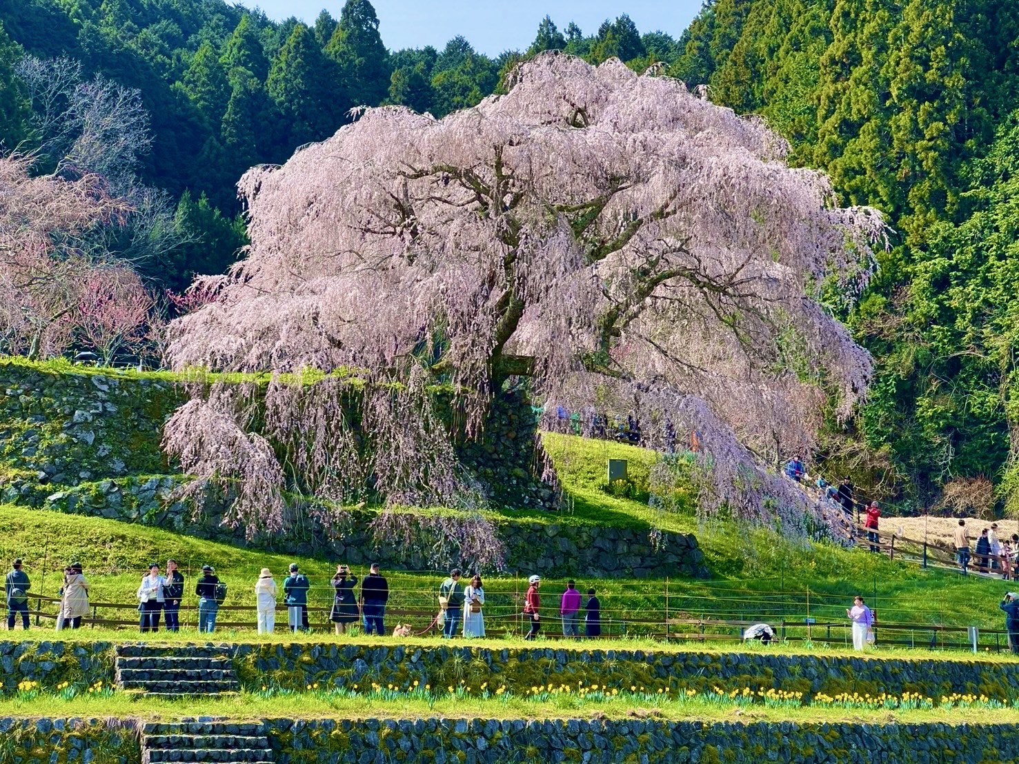 2025年4月5日の土曜日、奈良県宇陀市にあるとても有名な枝垂れ桜「又兵衛桜」を見に行ってきました。「又兵衛桜」(別名「本郷の瀧桜」)は、樹齢300年とも言われている見事な枝垂れ桜です。高さ13m、幹周り3mを超える巨木で、毎年多くの花見客で賑わいますが、私は行くのは初めてです。公共交通機関だと、近鉄榛原駅より奈良交通バス「大宇陀」行きに乗車(約20分)して、終点の「大宇陀」で下車。そこから徒歩で20分だそうです。桜のシーズンには周辺に民間の駐車場が数百台分あるというので、車で行くことにしました。向こうに着いたのは朝の9時頃でしたが、もう駐車場はどこもほぼ満車状態。それでも17分ほど並んだらどうにか駐車することが出来ました。駐車料金は500円でした。駐車場からは川を挟んだ向かいにもう又兵衛桜が見えるのですが、さすがにすごい存在感です!対岸から見た又兵衛桜 ↓橋を渡った先に、又兵衛桜があります。橋のところに、協力金として大人一人100円の寄付募金の箱があります。下から見た又兵衛桜 ↓滝の水が流れ落ちるように、石垣の上から垂れ下がる桜の枝……まさに「瀧桜」ですね ↓圧巻でした!駐車場のところで「焼きもち」や「こんにゃく」が販売されています。たくさんの方が召し上がっていました又兵衛桜の周辺には水仙やら他の種類の桜の木なども植えられています。又兵衛桜は見頃になっており、4月8日現在は満開状態のようです。本当に見ごたえがある、ド迫力の桜でした。※注 私たちが到着した午前9時時点でも結構な渋滞でした。シーズン中は渋滞覚悟で行くか、早朝に行ったほうがいいかもしれません。