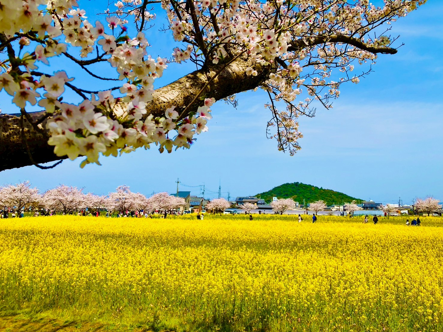 2025年4月5日の土曜日、奈良県宇陀市の「又兵衛桜」を見に行ったあと、奈良県橿原市の藤原宮跡へも行きました。ここでは、春は菜の花と桜、夏は蓮の花、秋はコスモスと季節の花々が植えられていて、それぞれの花のシーズンには見事な景色を楽しむことができます。(秋のコスモスの日記はこちら)時間的には又兵衛桜を見にいったあとだったので、藤原宮跡には午前11時頃に到着しました。さて駐車場へと思ったら、ここでもめっちゃ渋滞。 駐車場へ車をとめるだけでも一苦労でした。でも……ひとたび花園の中に足を踏み入れると…眼前にはまっ黄色の菜の花の海菜の花を囲んでいる桜も満開です菜の花と桜の共演が素晴らしいです本当に素晴らしかったです!せっかくここまで来たのだからと、近くにある「おふさ観音」にもお参りしてきました。藤原宮跡からは歩いて行ける距離です。こちらのお寺は「春のバラまつり」「秋のバラまつり」「夏の風鈴まつり」と季節ごとに目や耳を楽しませてくださいます。現在は「提灯まつり」の期間ということで、境内にはいくつもの提灯が下げられていました。本堂内を拝観するには500円の拝観料がかかるそうですが、境内は無料なので、気軽に境内を散策させていただくことができます。住宅街の中にあるこじんまりとした趣のあるお寺ですが、思っていた以上に中は広く、今度はバラまつりや風鈴まつりのときにもぜひお参りさせていただこうと思いました。又兵衛桜、藤原宮跡、おふさ観音と、半日で3か所もまわることが出来て、充実した日となりました。