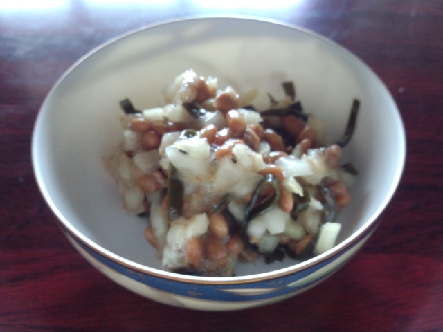 この納豆には、玉ねぎのみじん切りと昆布を混ぜてあります。