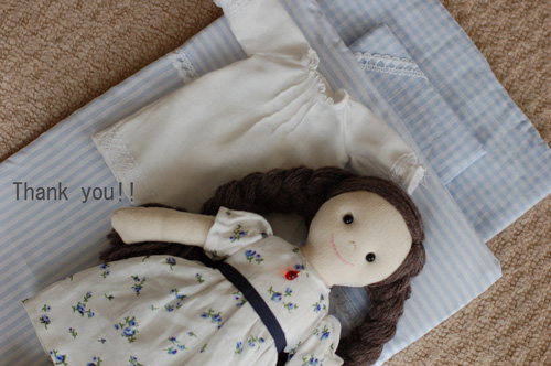 今日バアバのお家に行くと、とっても可愛いプレゼントが!!私のおばちゃんが作ってくれたお人形さんをバアバがプレゼントしてくれました。お布団やパジャマまで付いているの!!なんて可愛らしいのでしょう。理子はチューしたり寝んねーって寝かしつけたり「だいじだいじ」と遊んでいました。最近ママゴト遊びが大好きな理子。こんな素敵なお人形さんで遊べれるなんて幸せものだよ!!