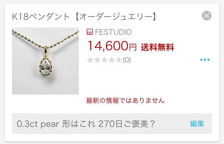 ブックマークを確認してたら、FESTUDIOさんの情報が取得できません、になってました。この3月17日で閉店したとのことでした。個人的にも何回かお世話になりましたが、気軽に手持ちの石を身につけられるようにしていただけるのはありがたかったものの、金の価格高騰で「気軽に」でなくなってしまってました。上の画像の金額は、金がg単価2000円台くらいのものだったように記憶してます。今はg単価が15000円ですものね…