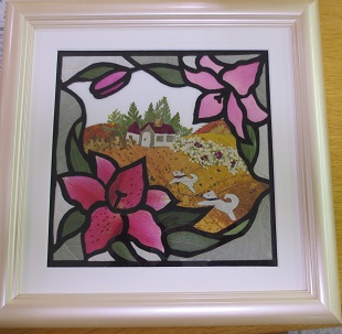 夢のある素敵なステンドグラス風ミニ額が完成しました。ワンちゃんが野原をかけっこしています。楽しそうですね~~見ているだけで心がなごんできます。いつも工夫いっぱいのSさんの作品です。 押し花・レカンフラワー日本ブログ村http://flower.blogmura.com/lecrinflower/
