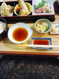 前菜、味のこってりしみこんだサービスのジャガイモの煮物、おさしみ、たけのこの煮物、アツアツの天ぷらにコーヒーついて1050円はとってもお得!