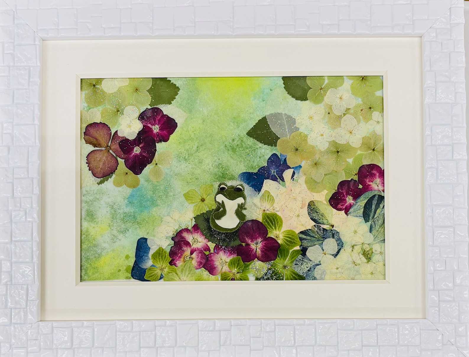 可愛いカエルの押し花額sさんの作品バックはパステル!何色も重ねた複雑な色合いが、とっても素敵です。同窓会があるので、久しぶりに会う友人に、プレゼント用に制作かわいらしいカエルさんですね~~~にほんブログ村