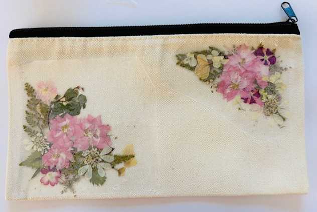 HMシートで作る押し花ポーチハルメク花アートカジュアルレッスン4Mさん作Iさん作Iさんは後ろにもワンポイント可愛い押し花ポーチが出来上がりました。にほんブログ村