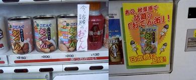 こてんぐ おでん缶日本橋に行ったとき秋葉原で有名な温かいおでんの缶詰を見つけました、よそにも自販機はありますがすべて売り切れでここでやっと買えました、ここでも「牛すじ」は、売り切れでしたがほかの2缶を食べてみました、寒かったせいもありますがおいしかったです、場所は日本橋5丁目13番の酒屋前でした・・・隣のナカヌキヤにプラパックに入ったおでんが99円で売っていたのでお土産に買って帰りました。