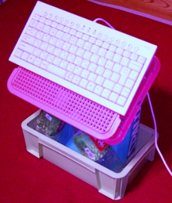 また、変なものを作ってみたパソコンデスクに座らずに、床に座って作業するとき今までは、床にキーボードを置いて使っていたが、どうにも使いづらい。あぐらをかいて、床のキーボードを長時間打つ場合、モニターはそのままデスク上のアームにあるので、腕と首を伸ばした状態になってつらい。前まで、ノートパソコンを床に置いて使っていたが、やはりメインPCで直接利用するソフトが多い為、不便に感じる。そこで考えたのがこの「書卓」ならぬ「キーボード卓」材料は、100円ショップのカゴ2つと靴の空箱、キーボードはUSBハブをかねた物にして両サイドに2箇所USBコネクタが付いているやつを購入、ここでUSB機器が使えるので便利(そのつもりで買ったが実際に使ってみると、ことのほか便利で驚いている)キーボードの角度を何度も調節して、座っても、寝転んでも打てるようにした(キーボードの高さは肘から手首の長さにして床に肘を着いて打てる)今のところ見た目が悪い意外は、問題なし。