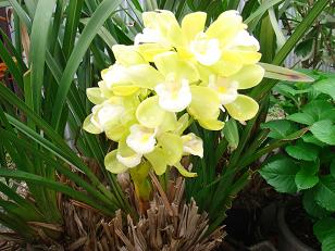 昨晩、実家の母が「お前にもらった蘭が咲いたよー」と電話がありました、今日は朝から実家に行って来ます。歩いて1分・・・同じ敷地に家があるので出かけると言うほどではありませんがね。裏に回って見渡すと鉢植えの蘭が綺麗に咲いていました、花は綺麗なんですが周りは草ボーボーの落ち葉だらけブドウの木やよくわからない蔦が絡みあいジャングル状態です。お互い草木の育て方には口出しせず、収穫物のみ分け与えます(たいした物は採れませんが)この蘭も株が増えすぎて鉢からはみ出しています、何年か前に株分けした時に母に3鉢あげた物だったはずですが、今はこの鉢だけが残ったようですね、手入れしないからなー。アップで花を撮るかとデジカメを近づけたら花の中はアブラムシでいっぱいでした・・・。うーむ、完全自然主義思想のたまものですかねー別名「ほったらかし」・・・ここだけ地面が残ってるのにもったいない話です、下手なことを言い出すと仕事が増えるので、そっとしておきますさいならー。