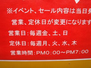 大阪日本橋のパソコンショップが今月初めにリニューアルオープンしたと聞いたので寄って見ました。金土日の昼からしか営業しないなんて・・・何か買って初期不良が出たら、いったいどうするのでしょうか?それよりも商売として成り立つのでしょうか、不思議な店もあったものです。結局閉まっていたので、どんな店か分からないので店名も場所もこの場では、控えさせてもらいます、終わります。