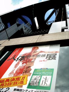 梅田スカイビルで開催している「人体の不思議展」あと3日で展示が終了すると聞き時間も空いたので連れを呼び出して行って来ました。はっきり言ってグロテスクな展示ですがめったに見れるものでもないので後学の為にお勉強です、目の前に本物の死体が多数転がっている光景は圧倒されますね。数体は実際に手で触れるものがあり、中でも本物の脳みそはなんとも言えない手触りでした・・・夢にみそうです。前売り券で\1,300円、どこかの送迎バスを利用したので運賃は無料。