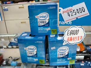 Intel Core 2 Duo E8400発売日に大阪日本橋を見て回りました、主だったPCパーツの店は協定を結んだ如く同じ価格でした、新製品発売キャンペーンもたいしたことも無く記念グッズや同時購入で少しだけ安く買える特典等で興味を引く物はありません・・・。今日回った中で不思議と安かったのが上新電機でしたこれに各種割引をセットすれぱだいぶと安く買えそうですね、私が買うのは2月に入ってからですがそれまでにもっと安くなっていればいいのですが・・・。今日は昼から冷たい雨が降り出した為に車で来る人が多くて、オタロードは大渋滞・・・その中を沢山の人が傘を差して歩くので、もー大変。でも新型CPUを搭載した実機をやっとドスパラで触ってきましたがさっぱり違いは分かりませんでした(当たり前ですがね)。各店相当数商品を用意したのかどこでも普通に売っており少々拍子抜けでしたがまずまず楽しめました、これで何も収穫のない寒い一日が終わりました・・・。