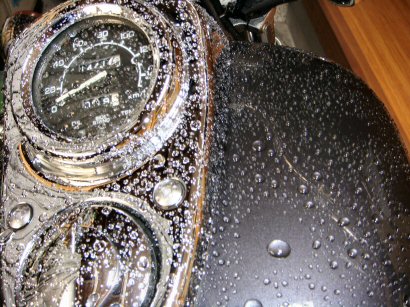 ワックスの効いたボディー出先から単車で帰る途中に雨に合う・・・。出掛ける時は晴れていたのに、この季節は濡れて単車で走ると笑えるほど寒いですね死ぬかと思いました。家に着いた途端急に晴れて走っている間だけ降っていた事に・・・嫌なエイプリルフールになりました。業務用合羽・クリアスーツ 1着単価\490!(30入り) #150