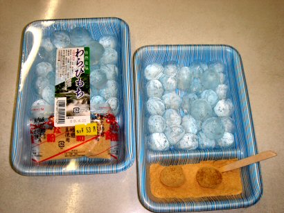 スーパーで2つ100円の「わらびもち」を買う。昼飯はおにぎり(100円)とバナナ(20円)とわらびもち(50円)・・・激安ランチ。デザートの「わらびもち」はタピオカの澱粉(でんぷん)を水でふやかしただけですがきな粉を付けると美味しくて食べました、残りのわらびもちを持って帰って夜にまた頂きます・・・。わらび餅粉 200G