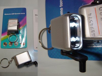 ミニダイナモライト大阪日本橋パソコンショップフレンズ\380-。1分間回せば10分点灯、スイッチを入れたまま発電すると約倍ほどの明るさで照らせる。車のキー等によく付けていた豆ライトと同じ位の大きさ(写真のリングが100円硬貨の大きさ)ですが驚くほど明るいLEDライトでした、店頭で見本を試して明るさと発電ハンドルがまわし易いのを確認してから2個購入しばらくは面白グッズとして見せびらかして、その後はカバンに入れておき電池が要らないので非常用に携帯予定です、1台は単車の工具ボックスに振動対策をしてから入れておきます、夜間走行時の非常灯用です単車のヘッドライトは明るいのですが単車自体は照らせませんからね。【20%OFF/販促品/ノベルティ/粗品/記念品/景品/企業PR/ギフトセット】ミニダイナモライト(キーホルダー付) (1ヶ)【ライト・キーホルダーギフトセット】