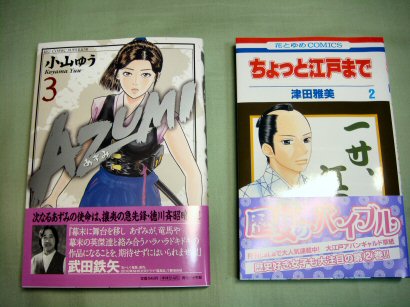 ・AZUMIあずみ 3 小山ゆう・ちょっと江戸まで 2 津田雅美COMICS JUNKUDO 難波店で購入始めはヤマダデンキLABI1なんばのポイントで買う予定が店に在庫が置いてない・・・ヤマダデンキの書店は新刊が出た時はいいのだが一度品切れになるとなかなか再入荷しないのとどこに何があるのか店員すら分らない事が多く探すだけで苦労します。ジュンク堂などの大型書店なら検索機が設置されているので探す手間が省けて便利ですね。幕末編の「あずみ」ですが話が暗すぎます、せこい悪役が多すぎて今後の展開が予想通りに進みすぎですもっと巨悪と戦う話になってもらいたいものです。「ちょっと江戸まで」は1巻を読んで面白かったから2巻が出るのを楽しみにしていたはずがすっかり忘れていた物を本屋で見つけました、これならLABI1にあったかもしれませんが合わせて購入。津田雅美の作品に外れ無し面白いです機会があればご覧あれ。AZUMIーあずみ(3)ちょっと江戸まで(第2巻)