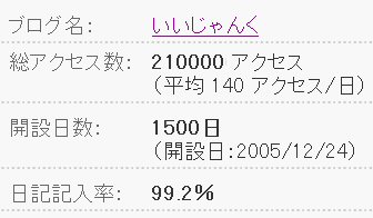 ブログデータ(管理ページより)ブログを始めて今日で1500日目です、アクセス数も切り良く21万でした。日記を書いた数は1491回、毎日書いているつもりでも9日抜けています、まだ精進が足りない明かしですね滅私奉公とまではいきませんが日々の積み重ねを大事にし出来うる限り毎日書き続けたい所存です・・・しかし堅い文章を書いてるとお寺で修行している気分になりますね。開設1500日の記念記事でした、さいならー。