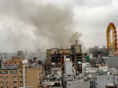 23日午後0時20分頃、大阪市中央区宗右衛門町3、鉄骨2階建てビル1階のステーキ店「喜多万」から出火。大阪市消防局の消防車など37台が出動した近くの屋上で作業中に多くの消防車が走り回る音で異変に気付く、見た時はもっと凄い煙が出ていました。しばらく作業を中断して見ていました。あの煙がこちらに流れてきたら今日の作業は中止にしますとの指示が出ましたがこちらには流れては来ませんでした。しかし火事は怖いですね、燃えるのも困るけどあれだけ水を掛けられたら周りも水浸しで洪水状態ですからね・・・。(14時に見たらまだ白煙が出ていました)