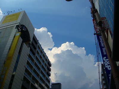 大阪日本橋の空この後すぐに写真の雲が広がって大雨になりました。通り雨だったのか電気街を見て回っている間にまた青空になり無事に単車でご帰還。雨に濡れずに助かった。入道雲スクリーン【装飾】